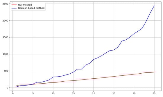 Comparison of computation time between the Boolean-based method and our method. The x-axis shows the number of characters, and the y-axis indicates the computation time (ms).