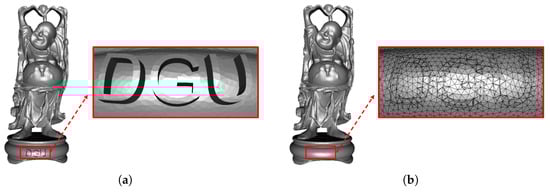 Watermarking of the text “DGU” on the Buddha model: (a) visible surface watermarking; (b) invisible watermarking via mesh refinement (wireframe view).
