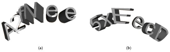 In addition, the generated 3D text meshes can be used in human–bot authentication systems such as CAPTCHAs. Traditional CAPTCHAs rely on 2D text, whereas extending them to the 3D domain introduces additional complexity that remains intuitive for human users but challenging for automated recognition systems [] (see Figure 19). In particular, rendering text on curved surfaces, adding surface noise, and introducing viewpoint variations pose additional challenges to AI-based recognition.