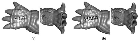 Insertion of the text “Hand” on the hand of the Armadillo model: (a) using the shrinkwrap modifier in Blender; (b) using the proposed method.