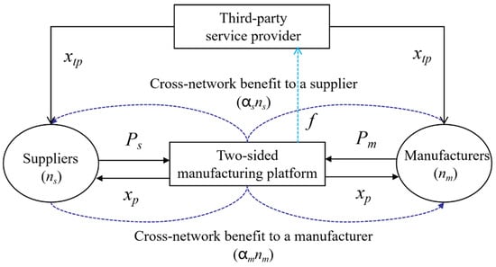 Exemplifying a bilateral market structure that integrates suppliers and manufacturers, the two-sided manufacturing platform exhibits a distinct market characteristic, that is, the cross-network externality symmetry, which refers to the correlation and mutual influence of joining utility between suppliers and manufacturers [,]. This symmetry reflects an equilibrium where both sides of the market exert comparable and interdependent effects on each other’s participation incentives. Given the effects of the cross-network externality symmetry, two-sided platforms widely use pricing strategies such as subsidizing one side and charging the other side in practice [,,]. However, with rapid development of the platform and the intensification of competition among two-sided platform enterprises, the subsidization strategy considering the cross-network externality symmetry no longer remains effective as usual in expanding the market scale [,]. Instead, the level of value-added service (VAS) investment (hereafter referred to as VAS level), a highly profitable and rapidly growing business, has become a more effective operational strategy for two-sided platforms [,,]. Commonly used VAS for two-sided manufacturing platforms include functions such as priority ranking, effective matching, payment security, and logistics supervision, which aim to enhance participants’ engagement and expand the positive effect of the symmetry of cross-network externalities [,]. This symmetry reflects an equilibrium where both sides of the market exert comparable and interdependent effects on each other’s participation incentives.