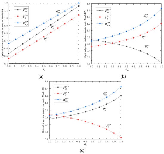 Optimal prices and access rates under Model PS with the change in (a) service level (); (b) cross-network externality (); (c) cross-network externality ().