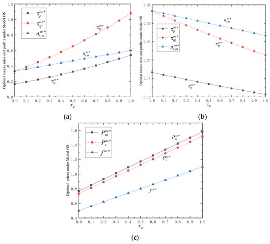 In Model OS, the platform hires an independent third party to provide a VAS. In this case, the third party provides the VAS for the platform’s bilateral participants and announces the price of each unit VAS. The platform decides the participants’ price . The decision sequence in Model OS is as follows: the third party announces the unit outsourcing price and provides the VAS first, then the platform decides the bilateral participants’ price. The superscript “OS” denotes Model OS. Based on the analysis above, we can obtain the profit function of the platform and the third party as follows.