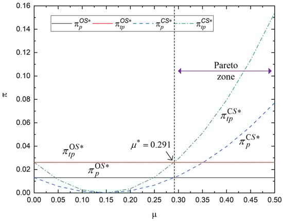 - When and , the platform should implement Model PS; otherwise, the platform should implement Model OS when . The profit comparison of the platform and the third party under two models is shown in Figure 4.