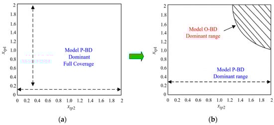 In Figure 6a, we simulate the profit of the platform under Model P-BD and Model O-BD with the change in the outsourced VAS level by setting . Under this scenario (), even if the outsourced VAS level is high, the platform is always prone to offering bilateral differentiated VAS to its participants by itself, which is in line with the findings of Proposition 5(ii). Similarly, in Figure 6b, we simulate the profit of the platform under Model P-BD and Model O-BD with the change in the outsourced VAS level by setting . Under this scenario (), there exists a Model O-BD dominant range in which the platform is inclined to hire the independent third party to provide bilateral differentiated VASs. Notably, the Model O-BD dominant range must satisfy the condition of the third-party service provider’s VAS cost coefficient being low and VAS level being high. This result is also consistent with the findings of Proposition 5(i). Therefore, we demonstrate that the results of the optimal platform’s VAS provision strategy choice continue to hold qualitatively both in identical and differentiated VASs.