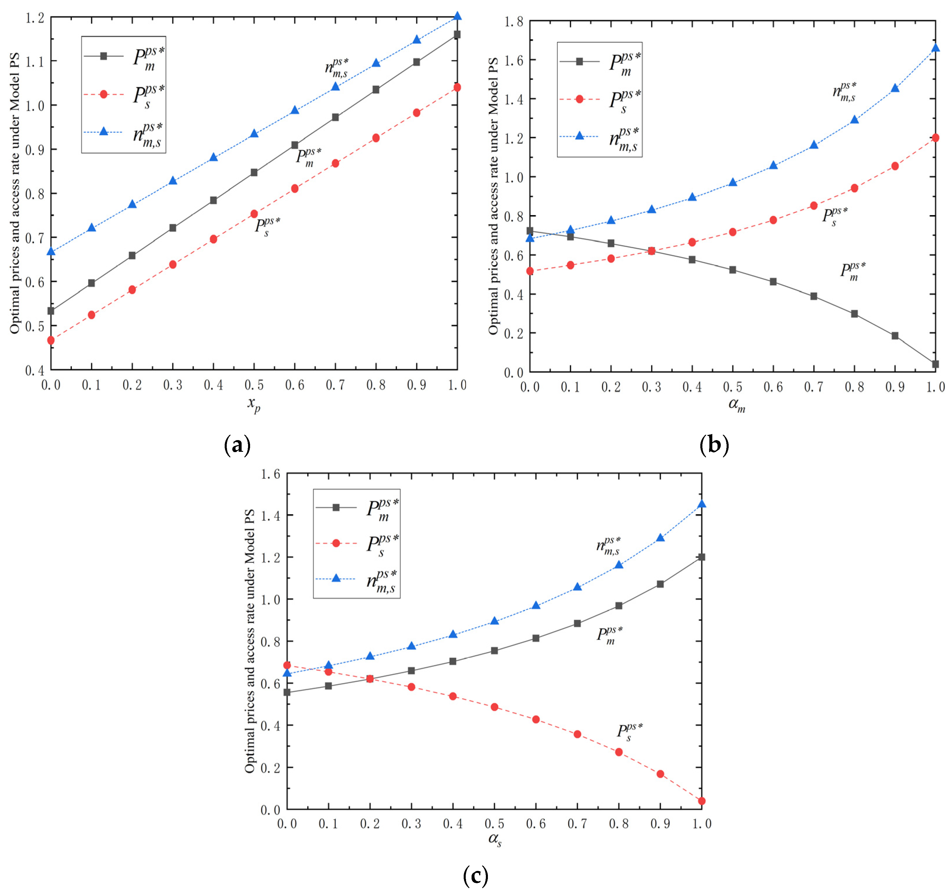 ) increases, thus the platform will decrease the price for manufacturers to encourage them to access. Under symmetric equilibrium conditions, suppliers and manufacturers experience mutually balanced cross-network utility flows, where suppliers gain proportional benefits from manufacturer participation that improve their access rate, while simultaneously manufacturers receive equivalent utility gains from supplier participation that enhance their own access rate, maintaining perfect reciprocity in platform value exchange. Therefore, the platform will also increase the price for suppliers and make up for the loss of decreasing the price for manufacturers.