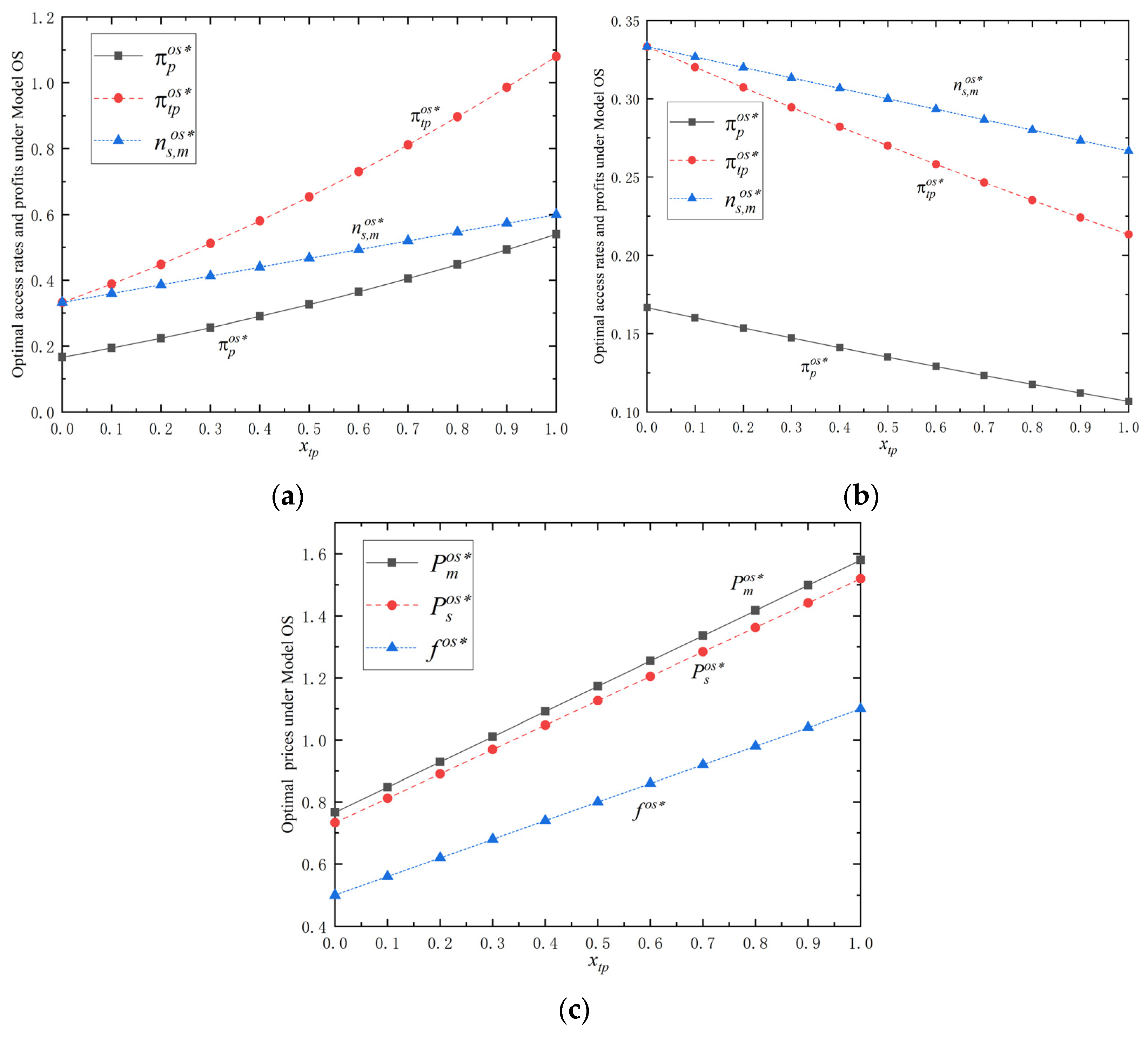 When and , the platform should implement Model PS; otherwise, the platform should implement Model OS when . The profit comparison of the platform and the third party under two models is shown in Figure 4.