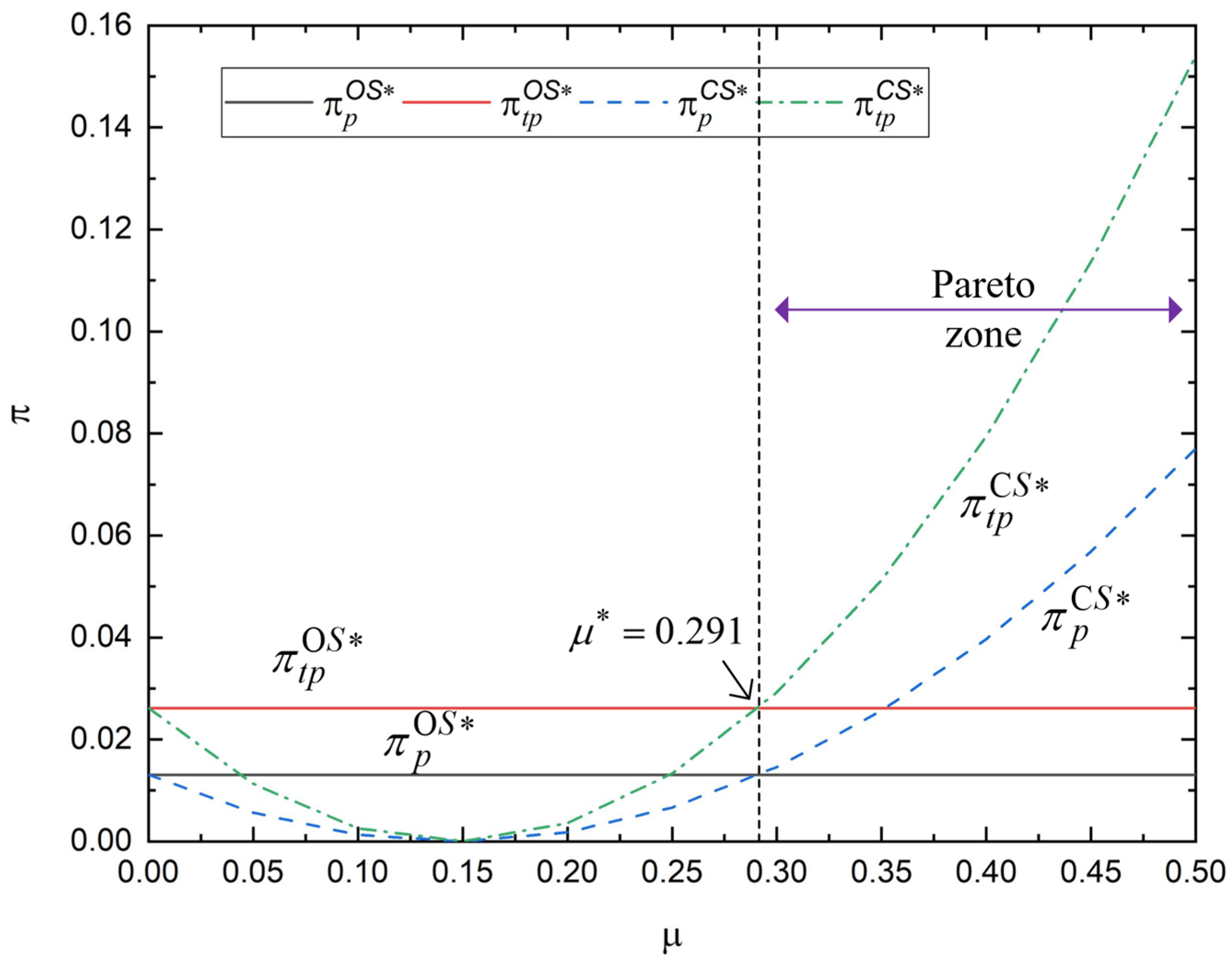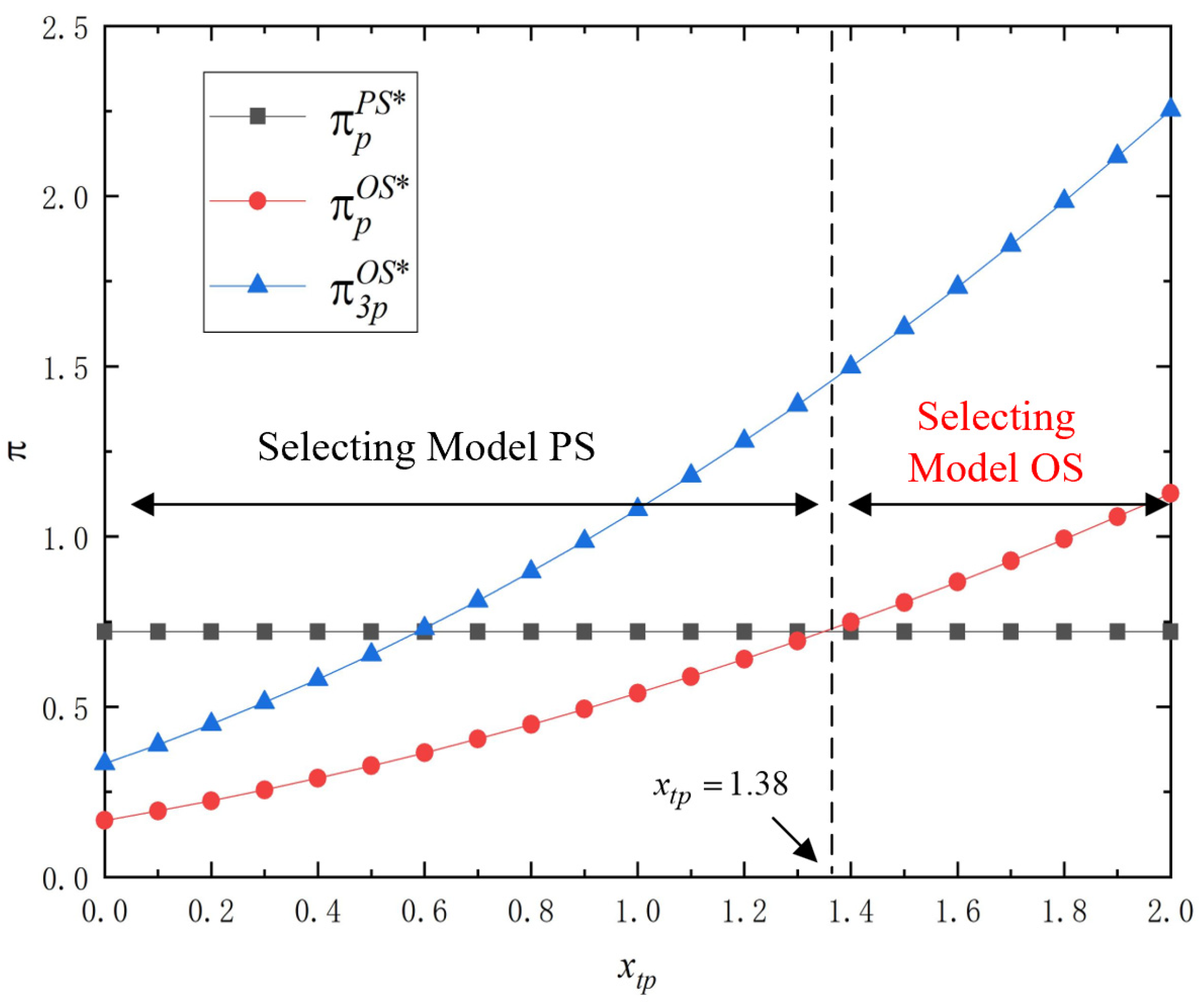 Proposition 3 compares the optimal bilateral participants’ price of the two VAS provision modes. First, the platform charges a higher bilateral suppliers’ price under Model PS than under Model OS only when the VAS level provided by the third party is relatively low. That is to say, the platform has stronger pricing power to set a higher price for its suppliers when the platform offers a relatively high VAS level by itself. Conversely, when the VAS level provided by a third party is relatively high, the platform will set a lower price for suppliers to compensate for the lower service utility that suppliers obtain. Second, the platform charges a higher bilateral manufacturers’ price under Model PS than under Model OS only when the VAS level provided by the third party is relatively low. The fundamental reason for the optimal manufacturers’ price is similar to the supplier-side price.