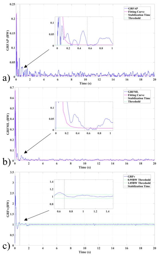 TTS in the vertical direction (TTSV): defined as the earliest time when vertical GRF remains within 95–105% BW for at least 100 ms.