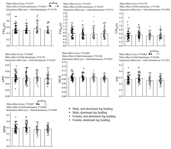 The two-way ANOVA results (see Figure 3) showed that, regardless of sex, the TTSAP on the non-dominant side after landing (0.53 s vs. 0.49 s, p = 0.015, F = 5.954, partial η2 = 0.023) was significantly greater than that on the dominant side. Irrespective of limb dominance, males exhibited significantly greater VSI (0.28 vs. 0.26, p = 0.044, F = 4.103, partial η2 = 0.016) and DPSI (0.29 vs. 0.27, p = 0.047, F = 3.982, partial η2 = 0.016) compared to females.