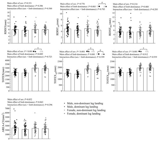 Comparison of dynamic postural stability between sexes and limb dominance. Note: * indicates a significant difference between males and females; # indicates a significant difference between dominant and non-dominant sides.