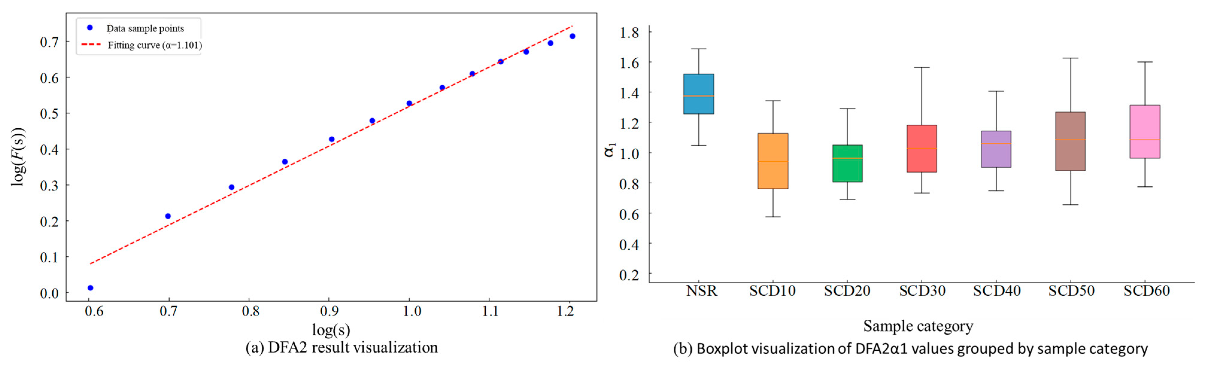 For the nonlinear feature extraction, Detrended Fluctuation Analysis (DFA) was employed to capture long-range correlations in heart rate variability, yielding a 1-dimensional scaling exponent. The DFA implementation required careful parameter selection including logarithmic scaling ranges (4–16 for short-term and 16–64 for long-term fluctuations), 50% segment overlap, and first-order detrending. Additional non-linear measures such as sample entropy were considered with embedding dimension 2 and tolerance threshold 0.2.