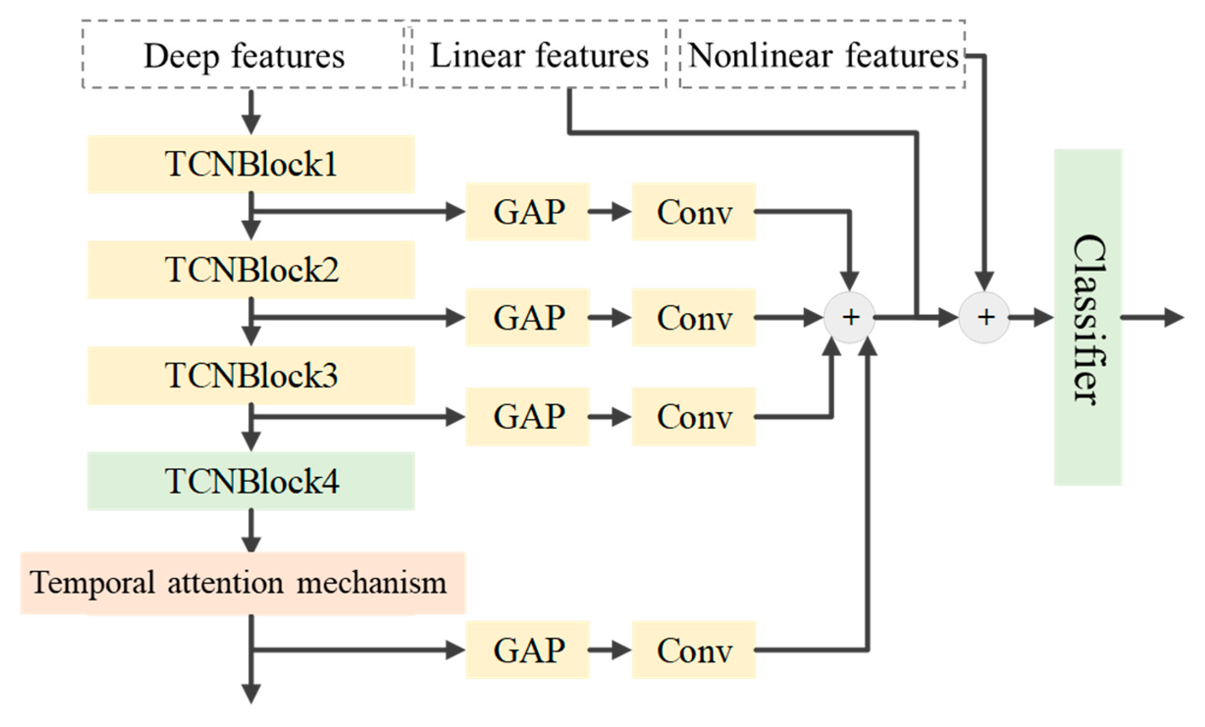 For the TCN-Seq2vec deep feature extraction module, a temporal convolutional network with multi-scale processing automatically learned hierarchical representations from raw ECG signals. The TCN architecture employed progressively increasing channels (32, 64, 128) with exponential dilation factors (1, 2, 4). A temporal attention mechanism with reduction to 64 channels and tanh activation highlighted clinically relevant segments. Comprehensive regularization included spatial dropout (0.5), feature dropout (0.3), and attention dropout (0.2) to prevent overfitting.