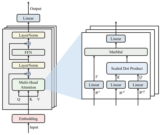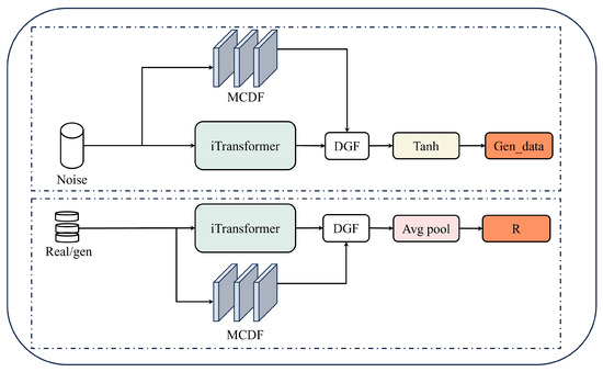 Figure 3 compares the token embedding schemes of the standard Transformer and iTransformer, and Figure 4 presents the overall iTransformer architecture. The model follows the standard Transformer pipeline—an embedding layer, stacked encoder blocks, and an output mapping—but differs in the token construction and embedding step. The input (either a noise sequence z or real/generated sequence ) is first reoriented (variables ↔ time) and linearly projected into a fixed embedding dimension . The resulting tokens are then processed by stacked encoder layers.