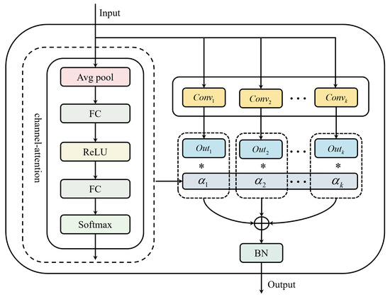 To enable dynamic selection and fusion of multi-scale features, we adopt a channel-attention mechanism [35]. As shown in the left panel of Figure 2, the module first applies a global average pooling operation to the input, aggregating the temporal dimension to form a channel-wise global descriptor. This operation compresses sequence information into a compact representation that summarizes each channel’s overall activation.