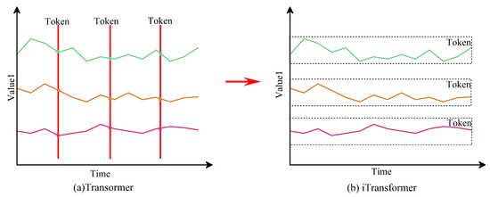 iTransformer is a structurally modified variant of the Transformer specifically designed for time-series forecasting. In standard Transformer models, inputs are tokenized along the temporal axis so that each token contains the feature vector of all variables at a single time step. This time-tokenization has two main limitations. First, because attention operates over time tokens, modeling very long-range temporal dependencies becomes computationally expensive, which restricts the effective receptive field. Second, although variables are contained within the same time token, the strict sequential progression of tokens may weaken the ability to model direct cross-variable dependencies over long horizons [20].