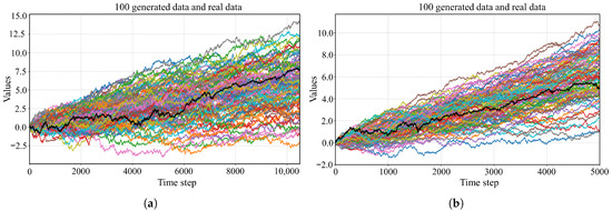 Figure 7 compares the realized prices (black curve) with the price paths reconstructed from the generated log-returns. As expected, the generated series closely track the realized series in overall trends and volatility. Across the 100 generated trajectories, the mean-reversion tendency of the MiT-WGAN-generated series largely coincides with the realized series, demonstrating the model’s ability to capture key statistical characteristics of financial time series. In addition, the generated samples exhibit volatility clustering and asymmetry, consistent with stylized facts in financial markets. This suggests that the model not only matches marginal distributions but also reproduces typical structural characteristics of financial time series.
