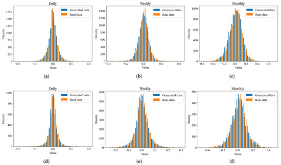 To further assess the distributional fidelity of the proposed MiT-WGAN, we plotted comparative density curves between realized prices and prices reconstructed from the generated returns at three time scales (daily, weekly, and monthly), as shown in Figure 8. The distributions of the generated price series closely resemble those of the real data across all three time scales, particularly in central tendency and overall symmetry. These results indicate that the model not only matches first-order statistics (mean and variance) but also aligns with higher-order moments (skewness and kurtosis).