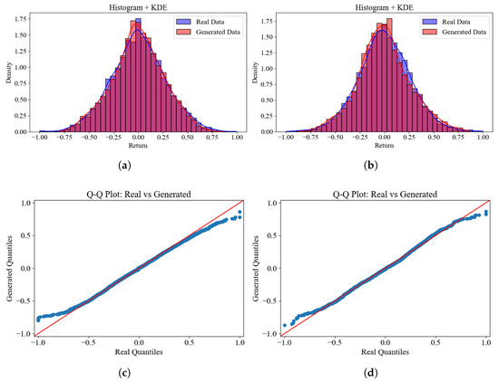 A comparative analysis was performed using histograms, kernel density estimates (KDE), and Q–Q plots of the true and generated log-returns across two stock datasets. The results for the AAPL dataset are presented in panels (a,c), whereas those for the AMZN dataset are shown in panels (b,d).
