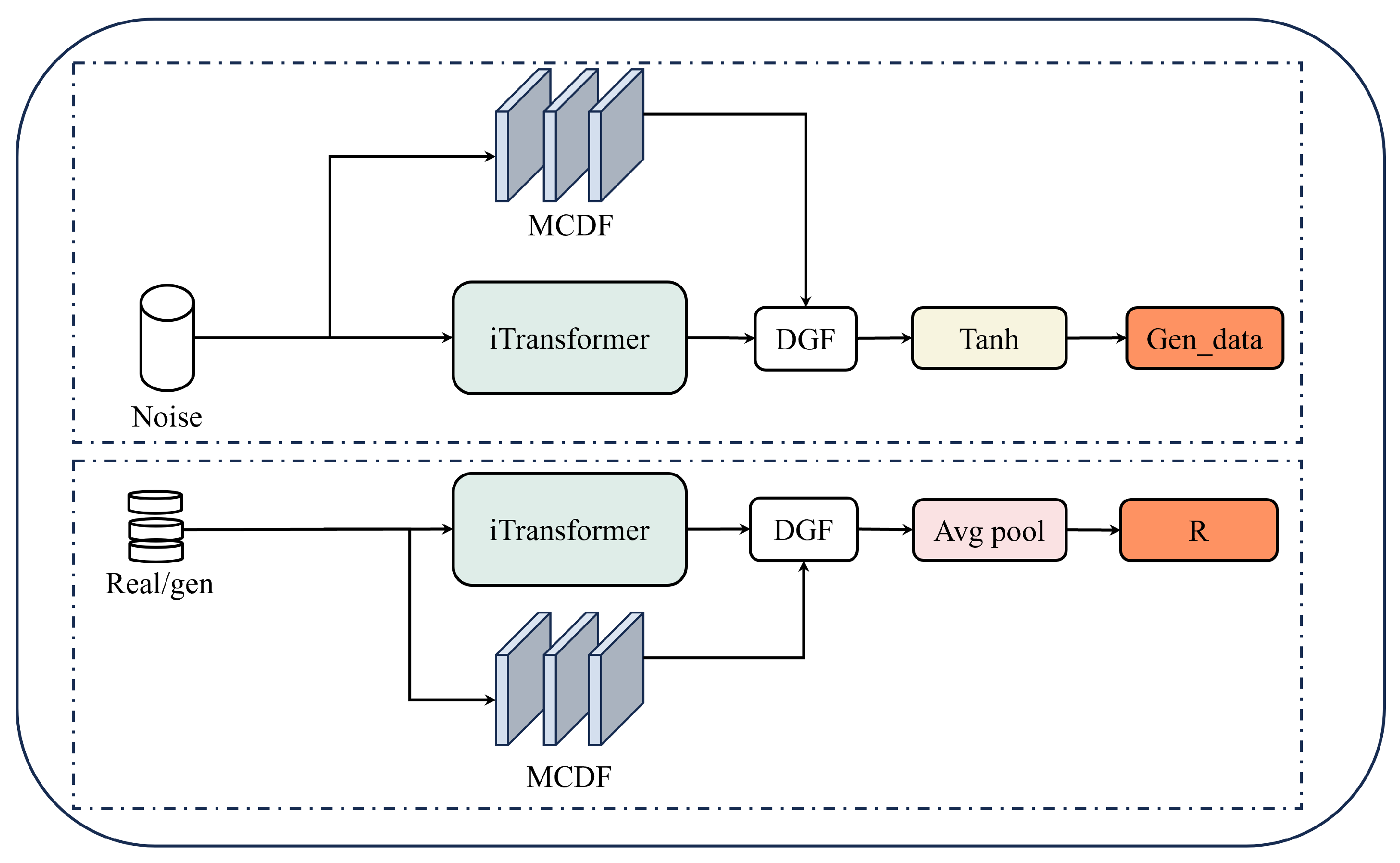 - The present study proposes MiT-WGAN, a hybrid generative adversarial framework for financial time-series generation. In contrast to extant methodologies that depend exclusively on a solitary feature extraction mechanism (e.g., QuantGAN based on TCN, TimeGAN relying on supervised embedding, and diffusion models using stepwise denoising generation), this study integrates multi-convolutional dynamic fusion (MCDF) with an enhanced Transformer (iTransformer) to concurrently model local multi-scale patterns and long-term temporal dependencies.