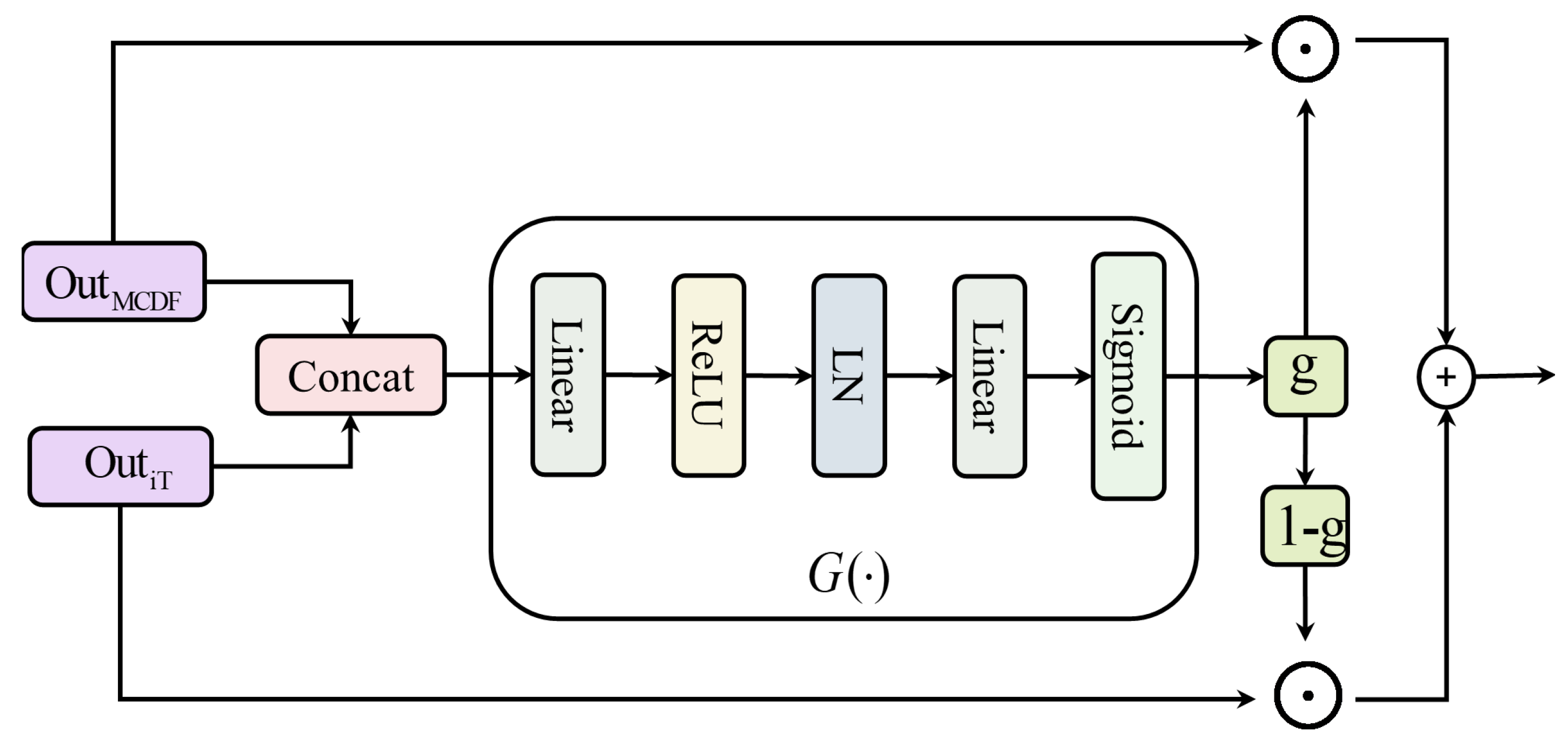 - The dynamic gated fusion (DGF) mechanism is introduced to achieve an adaptive balance between local and global features. In contrast to conventional methods such as simple splicing or static weighting, DGF employs a learnable gating unit to adaptively adjust the contribution ratio of the MCDF and iTransformer branches based on the characteristics of the data. This enhances the model’s robustness and its capacity for generalization in nonstationary financial sequences.