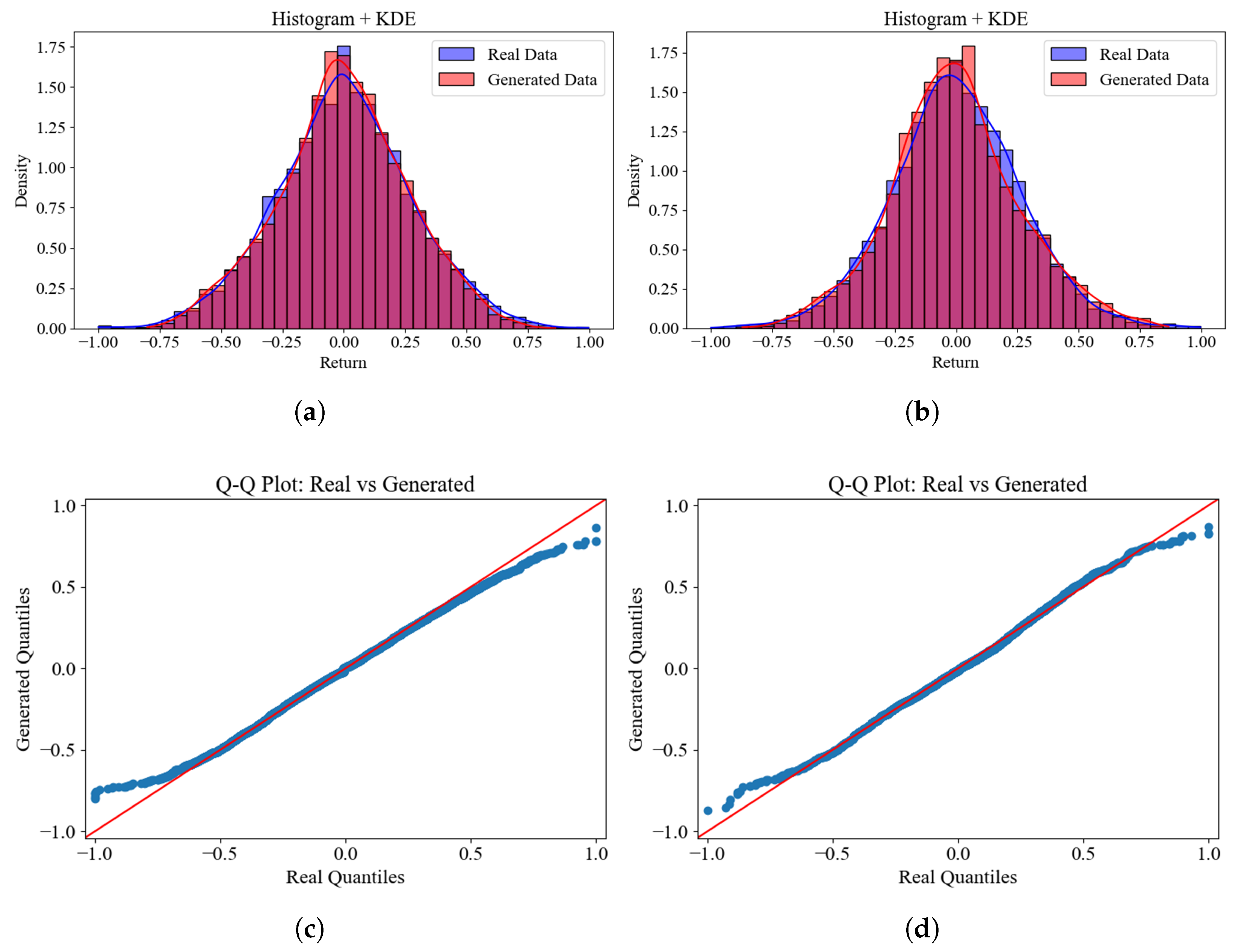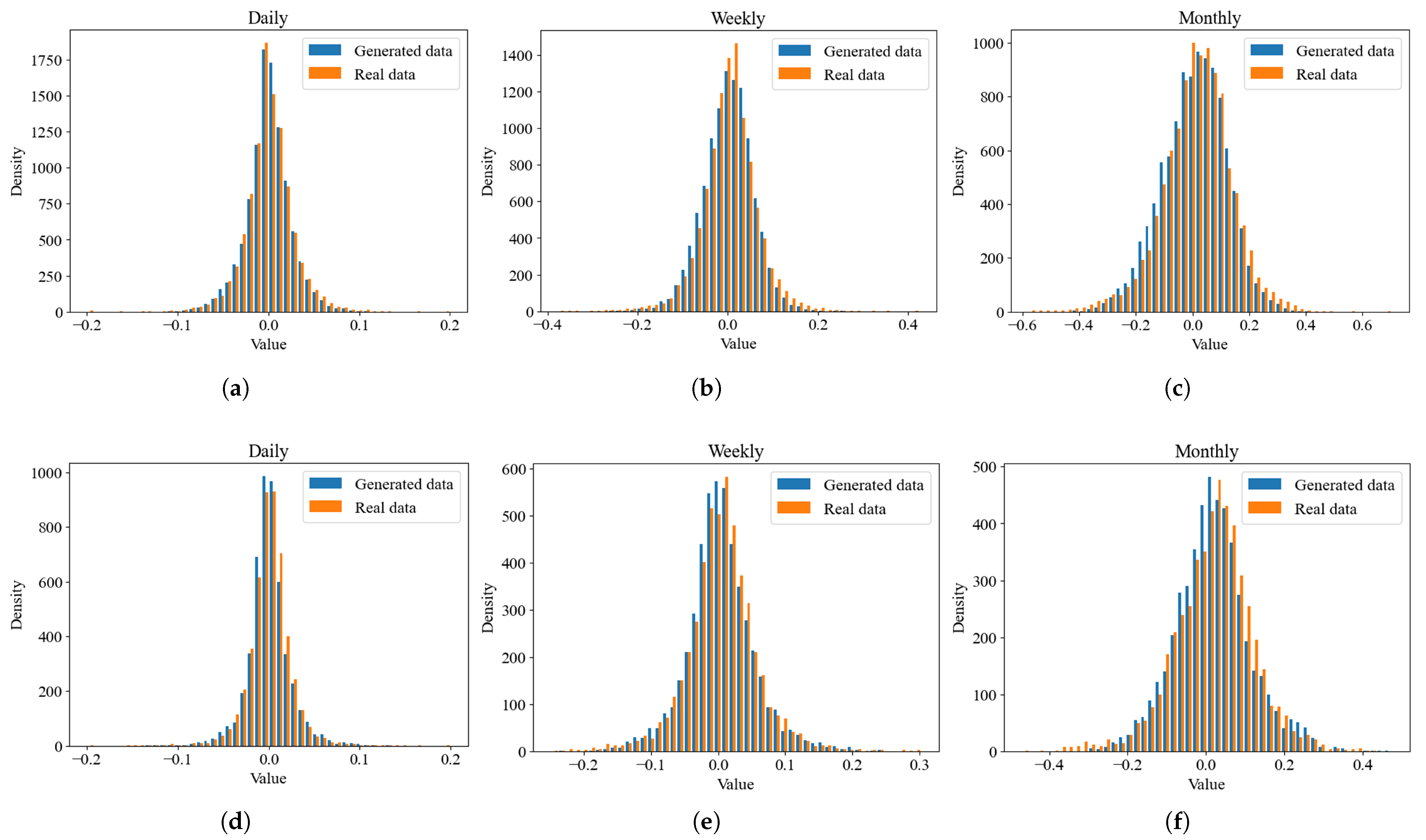 - Removal of the iTransformer module: Conversely, to examine the importance of global time-series modeling, the iTransformer branch was removed, retaining only the multi-convolutional dynamic fusion (MCDF) module. In this setting, the generated data depends solely on the convolutional architecture for feature extraction, which has been shown to be effective in capturing short-term dependency patterns. However, this approach is insufficient for adequately modeling long-term dependencies and the overall temporal structure. This experiment thereby facilitates an evaluation of the iTransformer’s effectiveness in capturing long-term dependencies in financial time series.