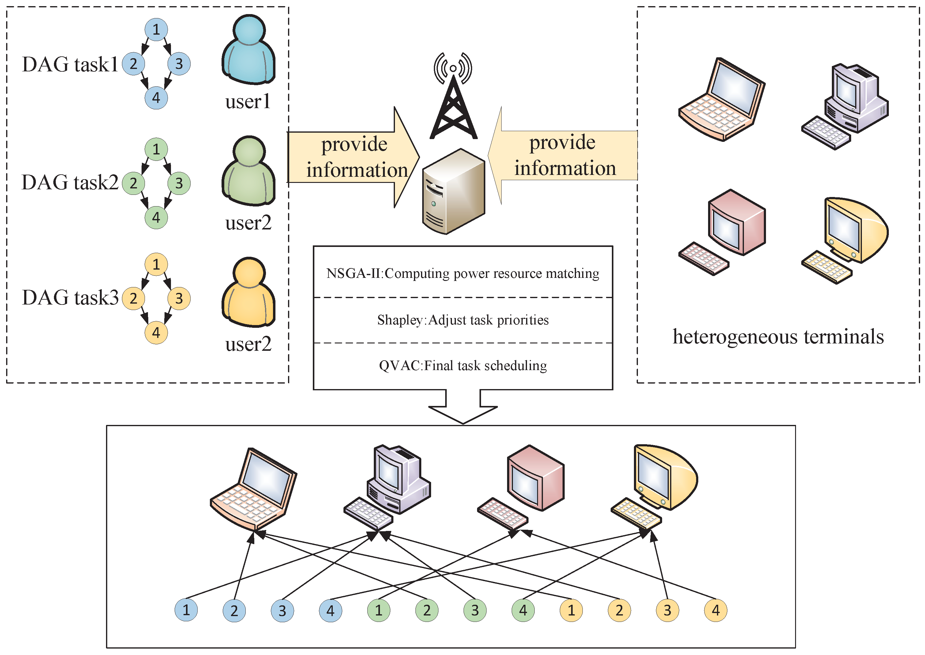 To address these challenges, this paper designs a task scheduling framework aimed at optimizing task allocation and execution workflows in heterogeneous computing environments. Figure 1 illustrates the architecture of the proposed task scheduling system. In this framework, tasks submitted by different users are modeled as DAGs and forwarded to a centralized scheduler. The scheduling server performs task allocation and execution order optimization based on task requirements, device capabilities, and task dependencies. The resulting scheduling scheme is then distributed to heterogeneous edge devices for execution.