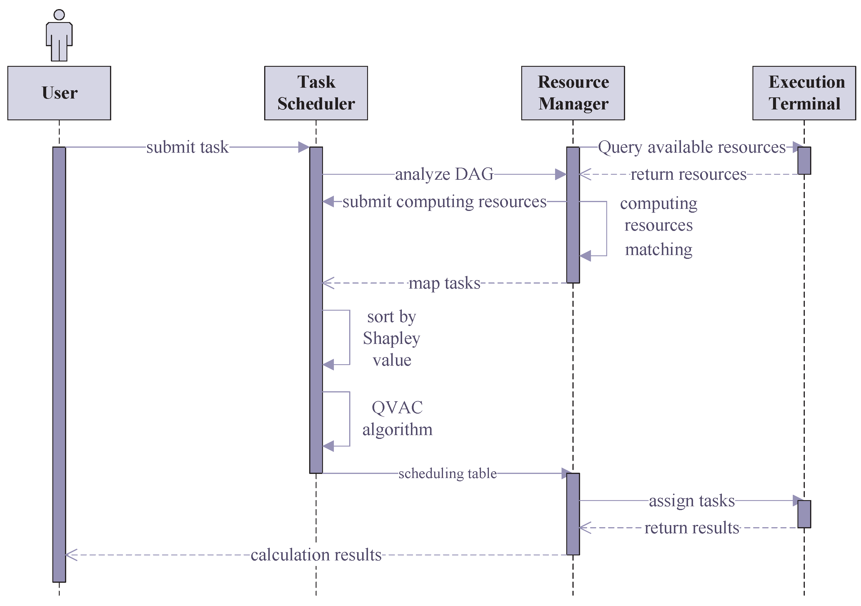 To address the aforementioned challenges, this paper presents a task scheduling algorithm that integrates NSGA-II for multi-objective optimization to match computational resources, incorporates the Shapley value to adjust task priorities, and utilizes the QVAC algorithm to optimize the task execution order. Through the synergistic combination of these three components, the proposed approach enables low energy consumption, low latency, and effective load balancing in heterogeneous computing environments, thereby enhancing overall system performance and symmetry; a sequence diagram is provided in Figure 3.