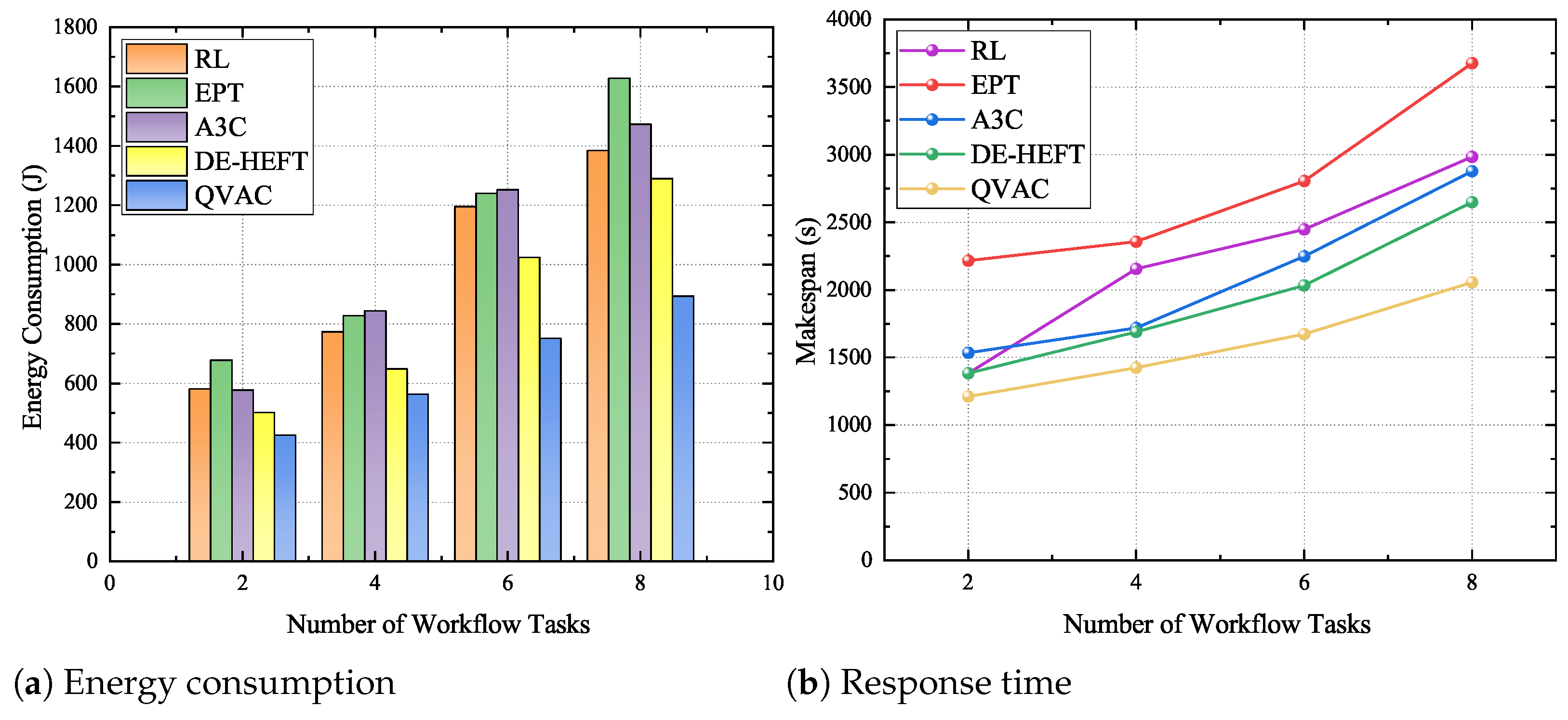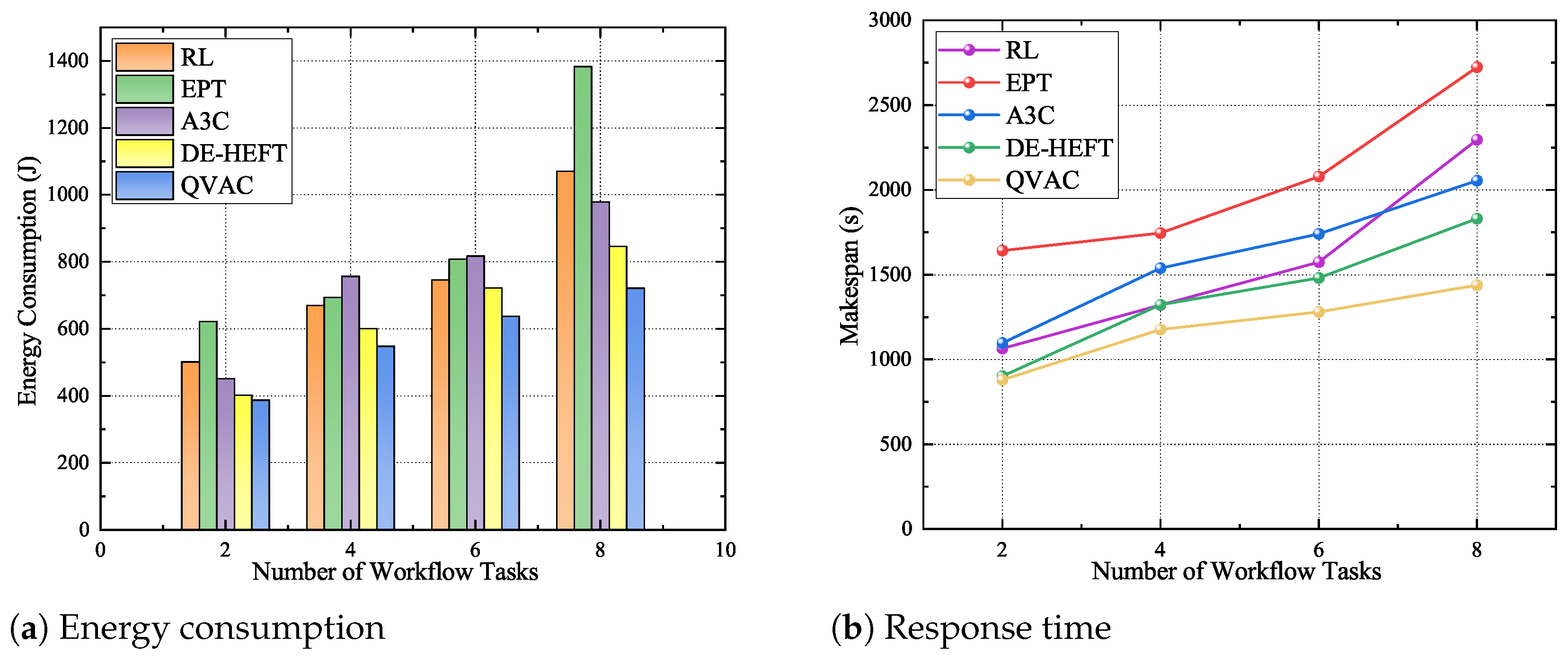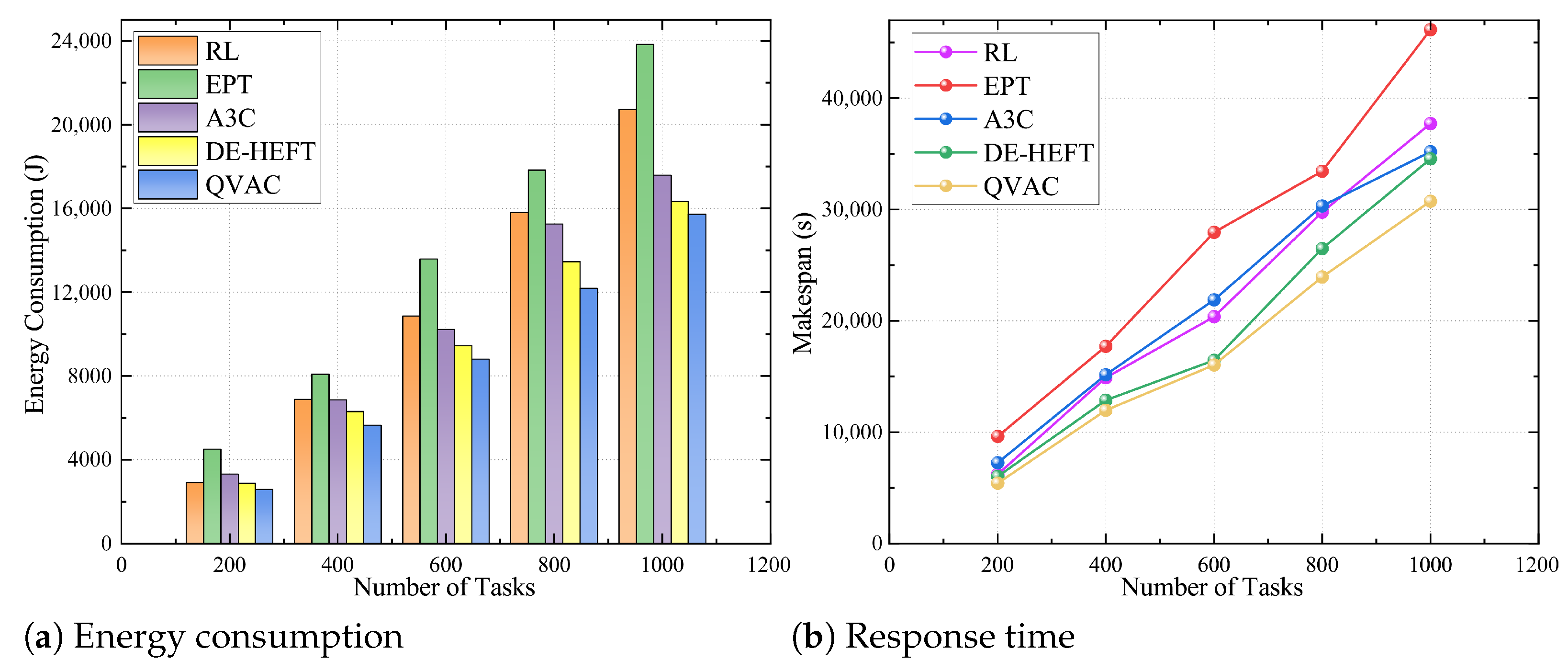 • A novel QVAC (Q-learning Value Actor–Critic) algorithm is proposed, wherein the traditional Critic component in the A3C framework is replaced by a Q-learning module. This modification enhances the stability and global search capability of the scheduling strategy. The proposed method simultaneously optimizes the task execution order while achieving low latency, reduced energy consumption, effective load balancing, and improved rationality in task allocation;