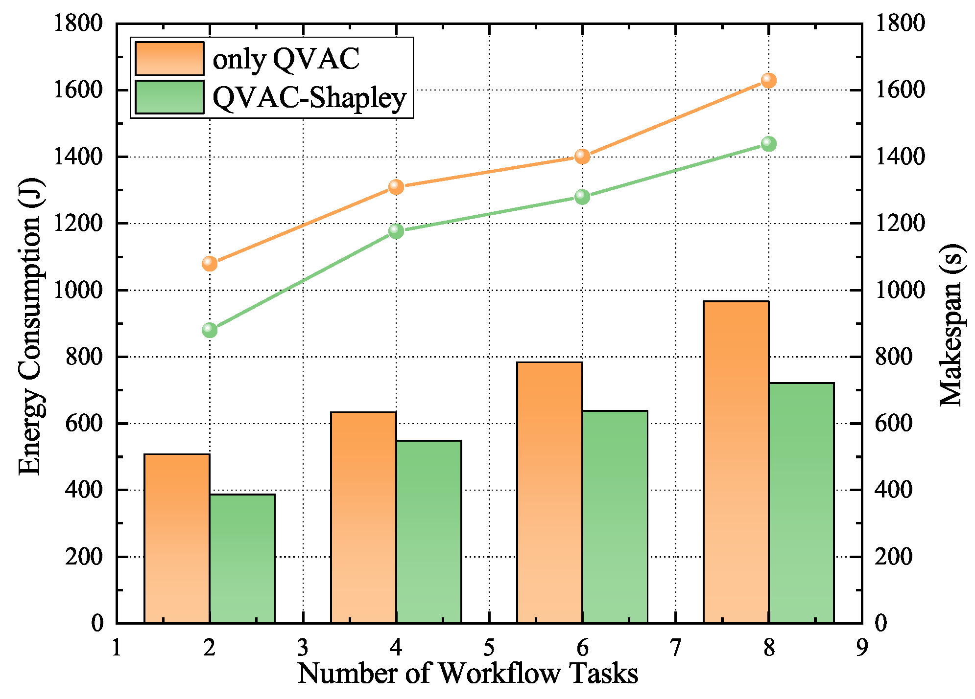 Figure 7. Comparison of energy consumption and latency of the Shapley sorting process, where the bar chart is the energy consumption and the line chart is the delay.