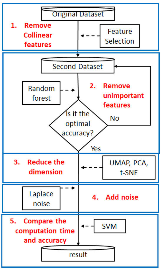 - In this step, the differential privacy guarantee is achieved through input perturbation, i.e., Laplace noise is directly added to the features of the dataset before they are used for machine learning tasks. This ensures that the original data cannot be reverse-engineered while still allowing subsequent steps, such as feature selection and dimensionality reduction, to operate on privatized inputs.For a dataset D, any query can satisfy -differential privacy as long as it satisfies the following algorithm M:where △ denotes the global sensitivity of the query Q, defined aswith D and being two neighboring datasets differing in one record. In this work, is determined based on the sensitivity of each feature attribute. The scale parameter is then used to sample from the Laplace distribution.Regarding privacy budget allocation, when multiple stages (feature selection, dimensionality reduction, and noise addition) access the raw data, we adopt a sequential composition framework.