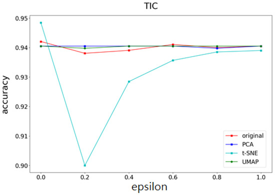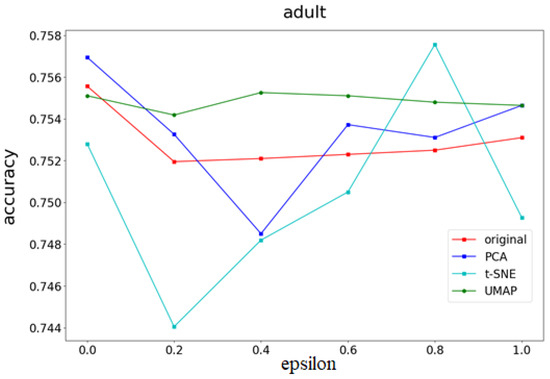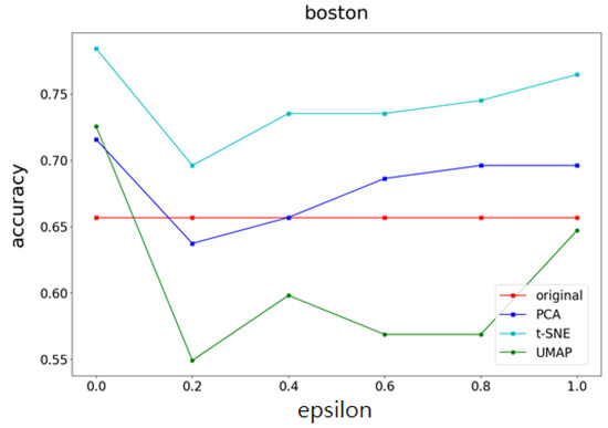 - Model accuracyTo protect data privacy, noise is added to the original dataset. Although this method can protect data privacy, the accuracy of the machine learning model will decrease. Therefore, to understand the impact of this method and PCA and t-SNE methods on the accuracy of differential privacy machine learning models, as well as the impact of different feature numbers and data amounts on accuracy, the following are compared under the same privacy budget and the same model: