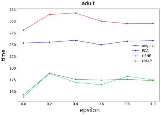 - Total computational timeThis research method primarily consists of the following four parts: correlation analysis, feature screening, feature extraction, and noise addition. These steps will generate different computational times depending on the size of the dataset or the number of features. Therefore, we will evaluate whether this research method can reduce the training time of machine learning compared with the method using PCA and t-SNE, and we will determine the impact of different feature numbers and data sizes on computational time. This study will compare the following under the same privacy budget and the same model: