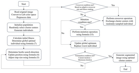 To clearly illustrate the workflow of the proposed CMBAS algorithm, a detailed flowchart is provided in Figure 1. The conversion of the input image to the Lab color space in the initial step is motivated by its perceptual uniformity property. Unlike RGB, which is device-dependent and non-linear in terms of human color perception, the Lab space is designed to approximate human vision. In Lab, the Euclidean distance between two colors corresponds closely to the color difference perceived by the human eye. This characteristic is particularly advantageous for image segmentation, as it allows the subsequent clustering process to operate in a space where color differences are semantically meaningful, thereby facilitating the generation of more accurate and visually coherent segmentation results. While other spaces like HSV and YCbCr also separate luminance and chrominance components, they do not achieve the same level of perceptual uniformity as Lab. The specific steps of the algorithm for image segmentation are as follows: