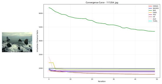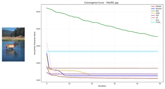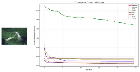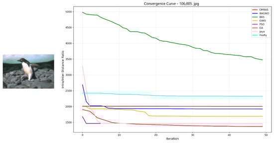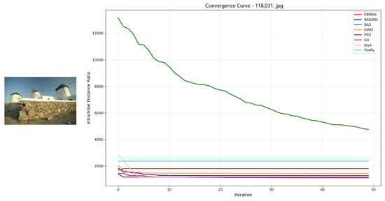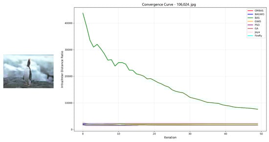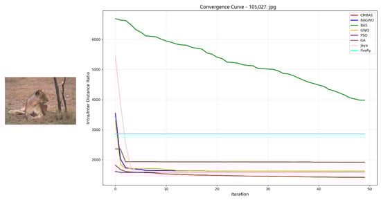 To comprehensively evaluate the convergence characteristics of the proposed CMBAS algorithm, extensive experiments were conducted on eight diverse images from the BSDS dataset, comparing its performance against seven state-of-the-art optimization algorithms: BAGWO, BAS, GWO, PSO, GA, Jaya, and Firefly. The convergence behavior was analyzed through the intra/inter-class distance ratio metric, which serves as a key indicator of segmentation quality, with lower values corresponding to more compact clusters and better separation between distinct instances.