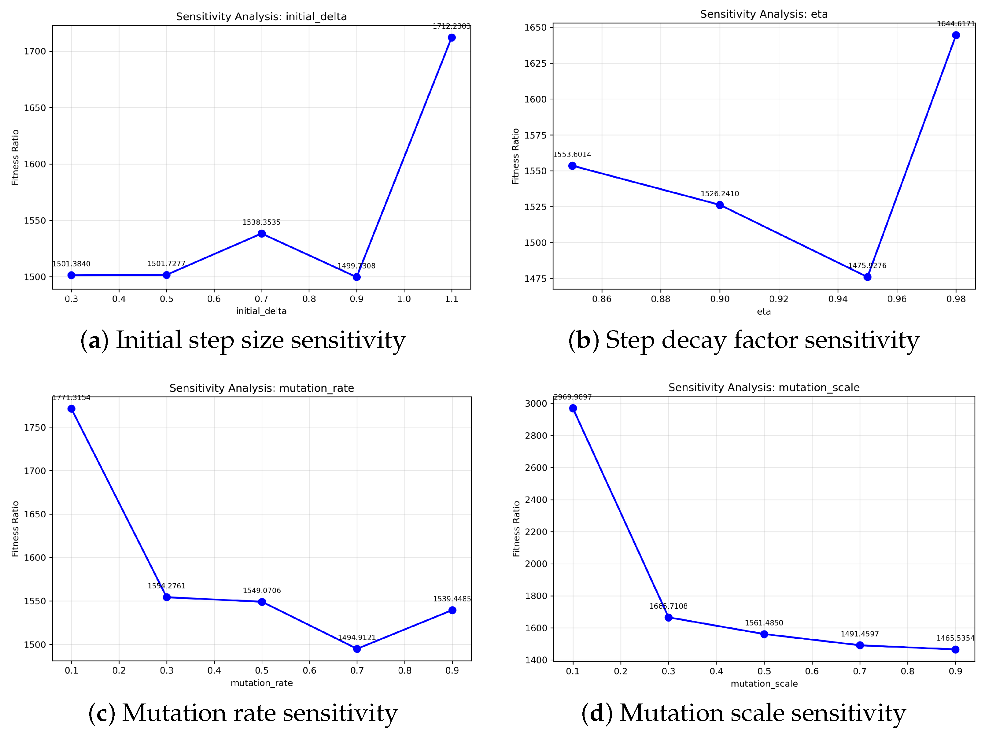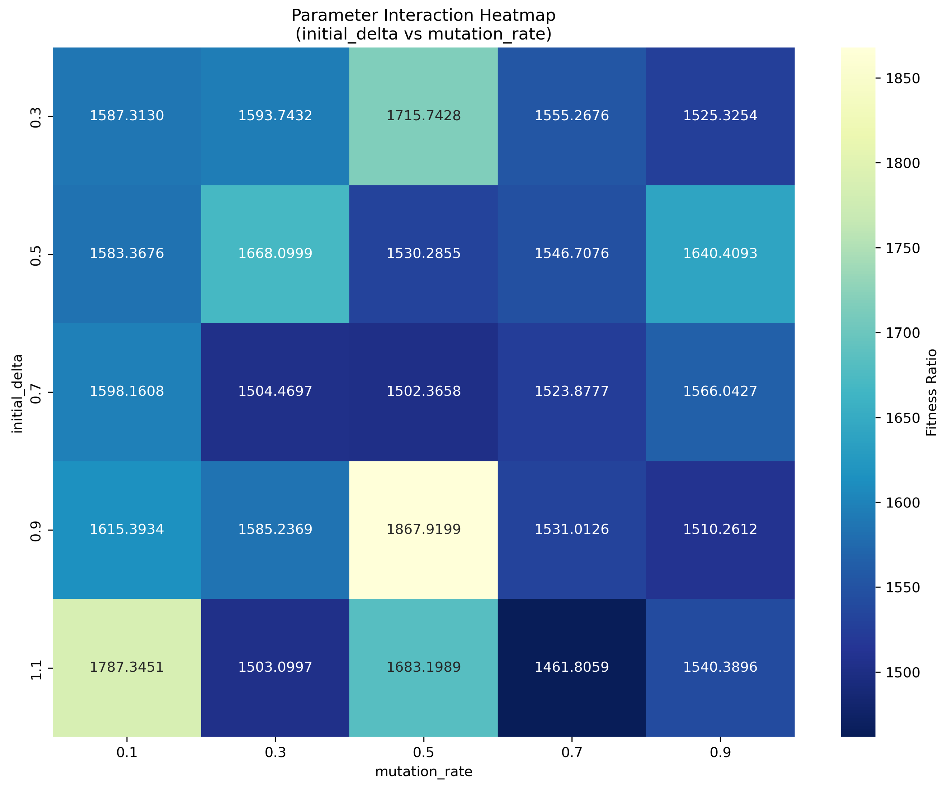 - The combination of initial delta = 0.9 and mutation rate = 0.7 consistently produced the best performance (fitness ratio: 1461.81) across multiple test scenarios.
