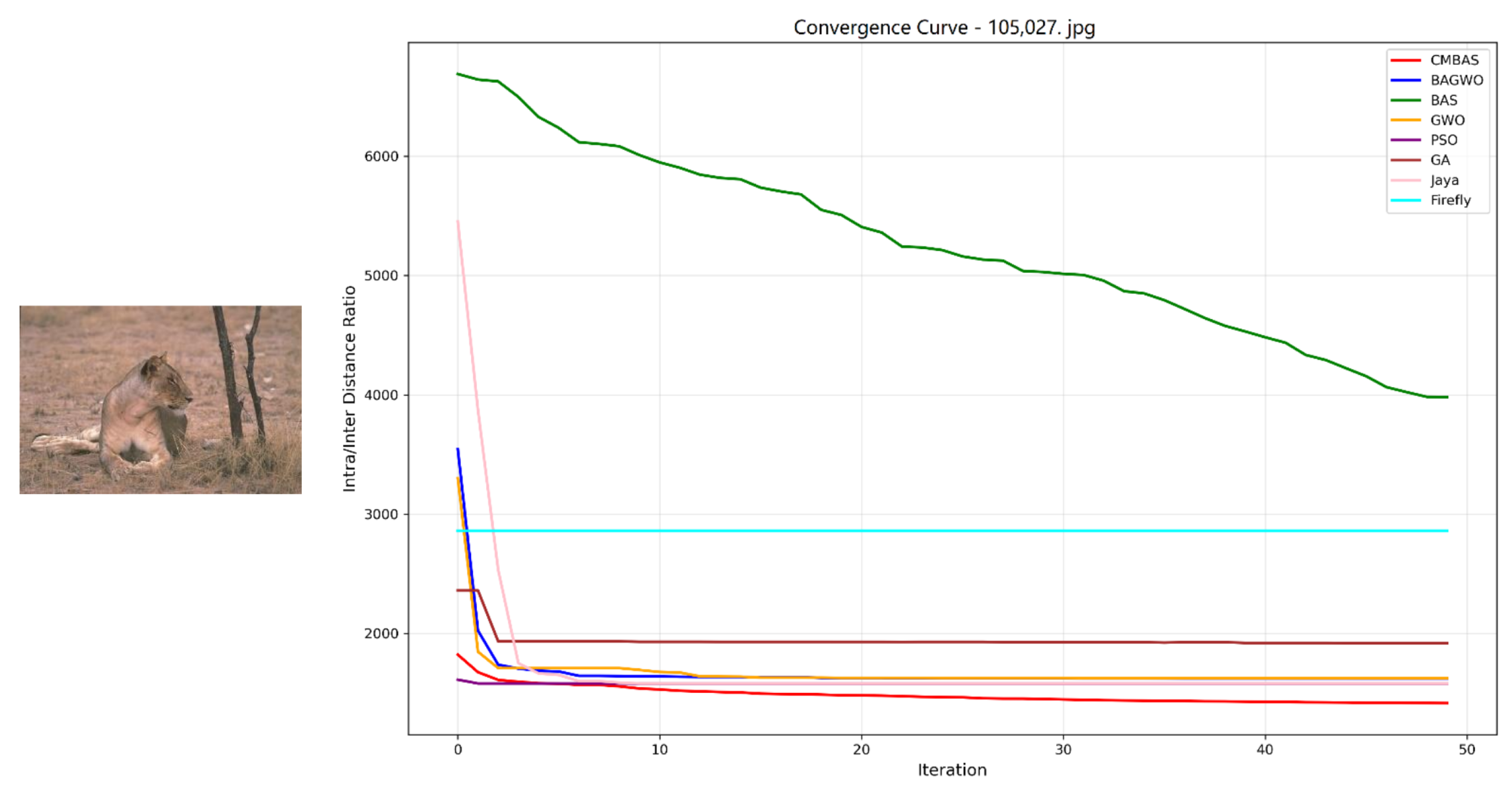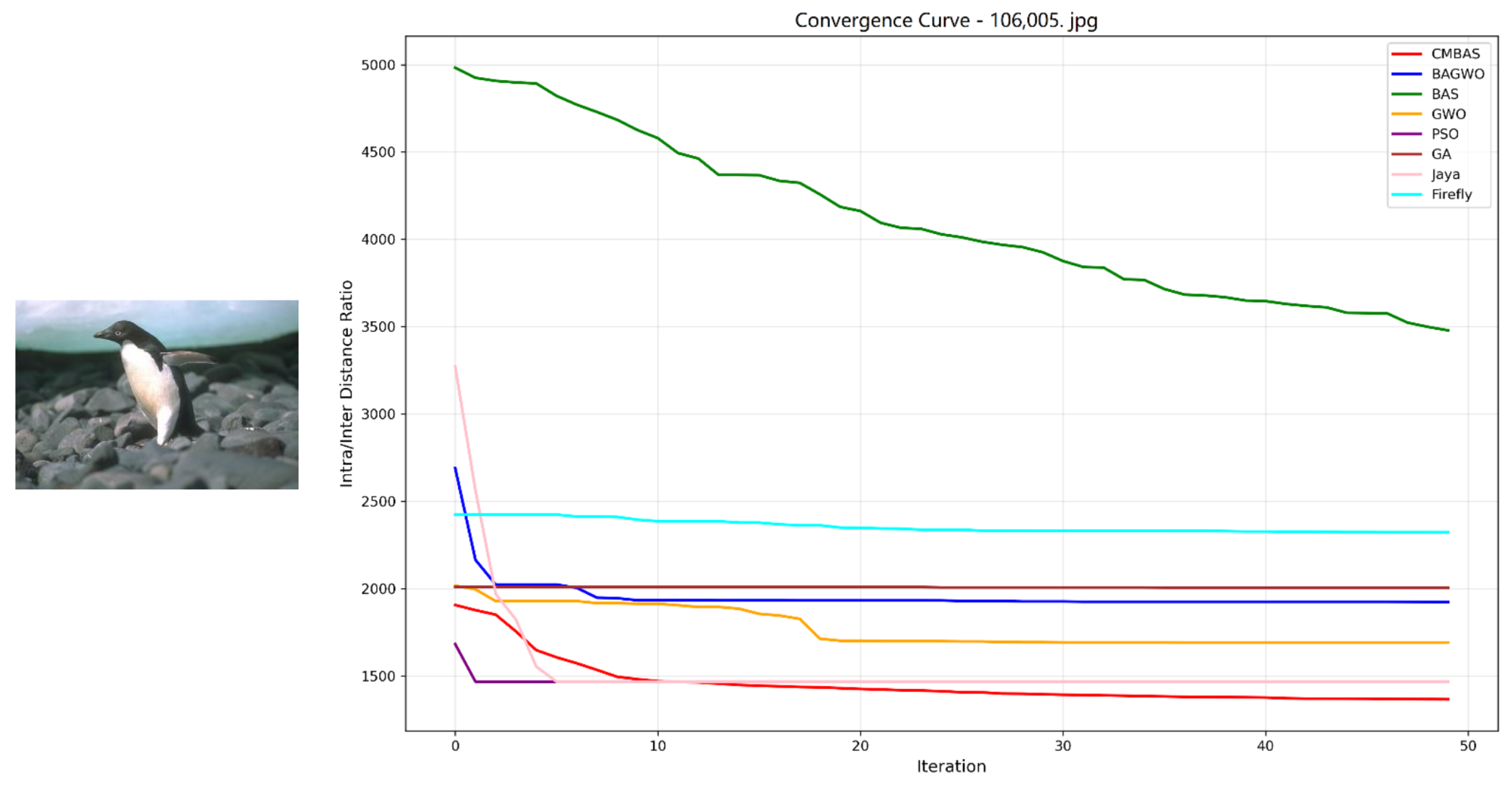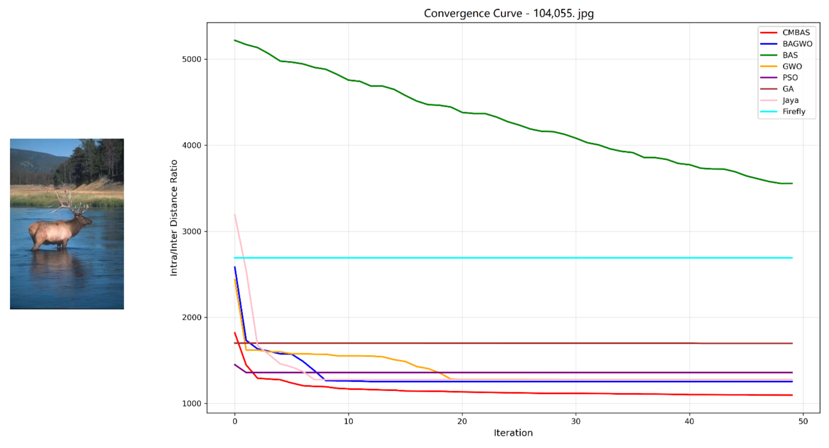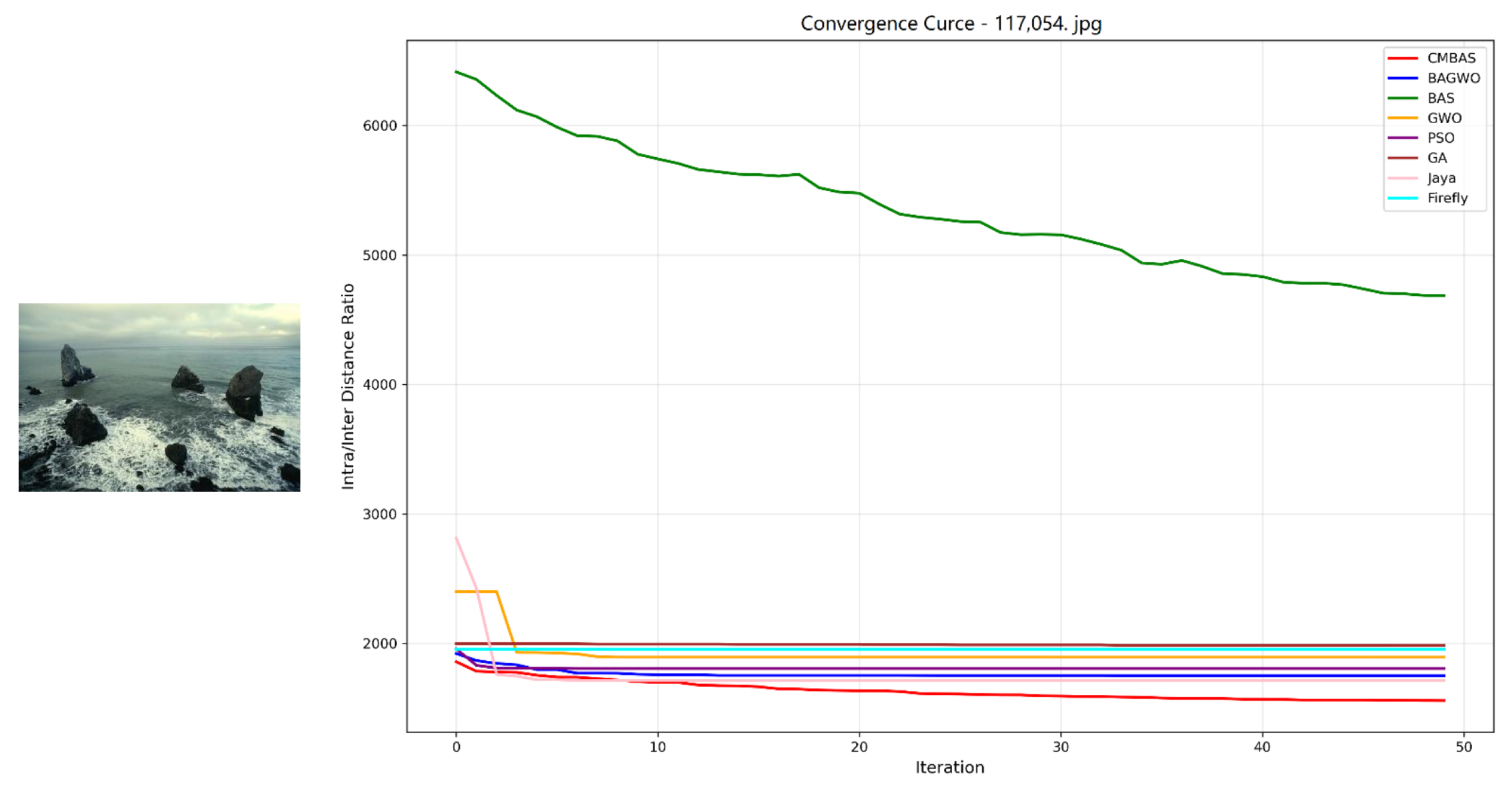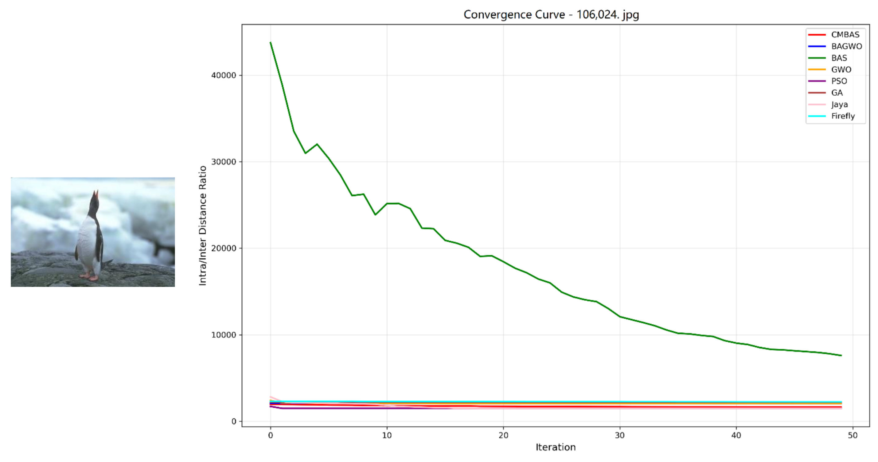 - Superior Final Convergence Values: In all experimental cases, CMBAS converges to the lowest final intra/inter-class distance ratio, indicating optimal cluster compactness and separation. Particularly in Figure 6, Figure 11 and Figure 12, the performance gap between CMBAS and the second-best algorithm is substantial, demonstrating the algorithm’s ability to identify high-quality segmentation solutions that elude other methods.