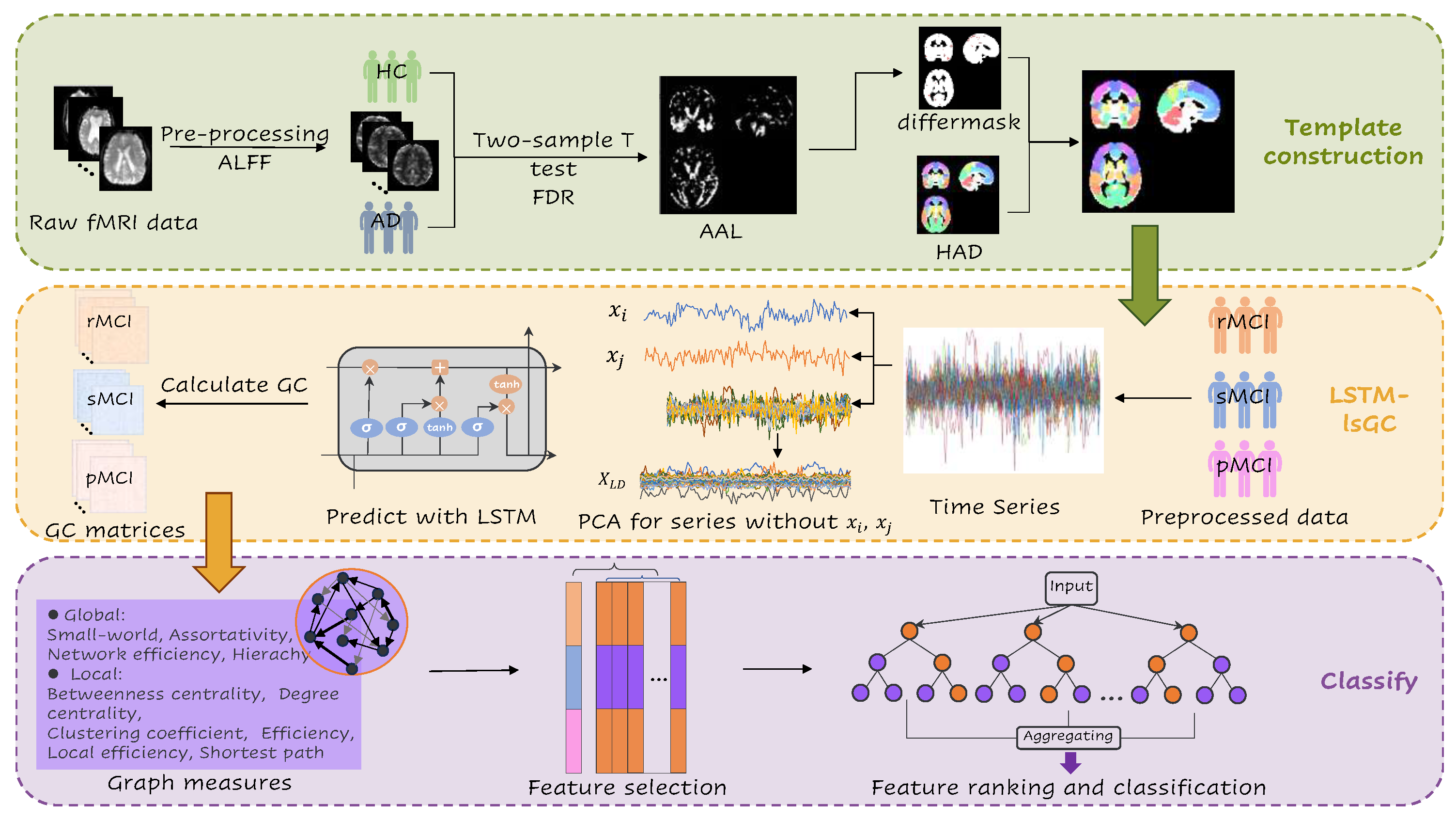 Figure 1. It consists of template construction, EC calculation with the LSTM-lsGC model, and feature selection and classification. It is summarized as follows. (1) We compared the ALFF between subjects in the HC and AD groups to obtain significant difference voxels and construct the HAD template. The HAD mask was constructed entirely from HC and AD data, with no overlap between these subjects and the MCI dataset used for the classification tasks. (2) For the EC matrix, we calculated the Granger causalities by applying the LSTM-lsGC model. (3) We used the selected features obtained from global and local features to identify MCI in three states. In addition, comparisons were made with brain effective connectivity networks constructed using an automated anatomical labeling (AAL) template and pairwise conditional Granger causality (PGC) from the MVGC toolbox [