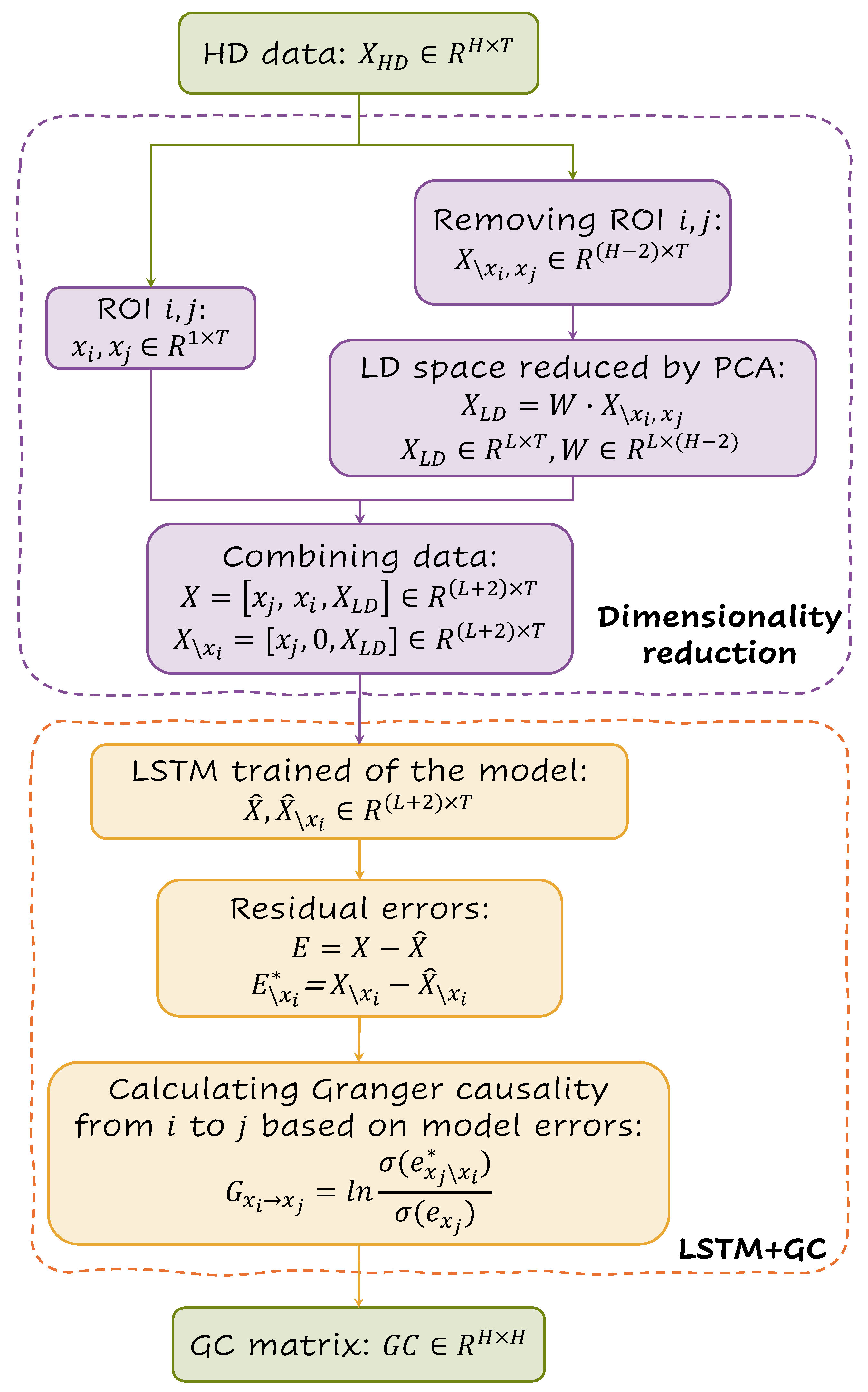 A drawback of the MVAR approach is that model parameter estimation is infeasible for high-dimensional (HD) data. We combined principal component analysis and Granger causality to overcome this drawback. The original high-dimensional data were split into two parts: one part consisting of the regions of interest (ROIs) () for which we aimed to explore causality and the other part being for the remaining ROIs. For the remaining ROIs, we applied PCA to reduce the dimensionality, transforming the high-dimensional data into a low-dimensional (LD) form, which was then combined with the extracted ROIs. The predictions were then made using the LSTM model, and Granger causality was calculated thereafter.