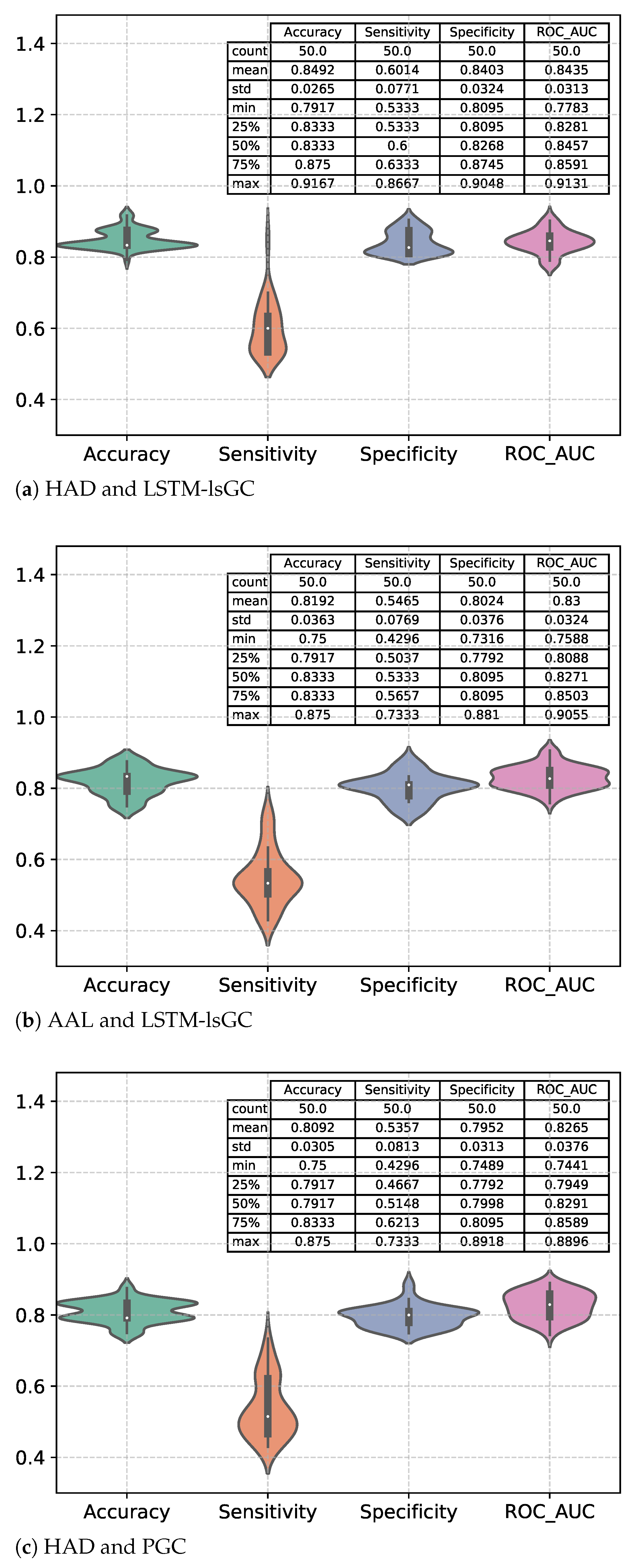 Figure 3, the framework of extracting ROIs’ time series using HAD and calculating effective connections via LSTM-lsGC achieved the best classification performance, with the accuracy mainly distributed above 80%, and the distributions of the sensitivity, specificity, and ROC_AUC were also significantly higher than those of the other two groups. The results of our work confirmed our expectations, not only improving the performance of triple classification but also enabling a multifaceted exploration of the MCI transformation process through self-defined templates and extracted features.