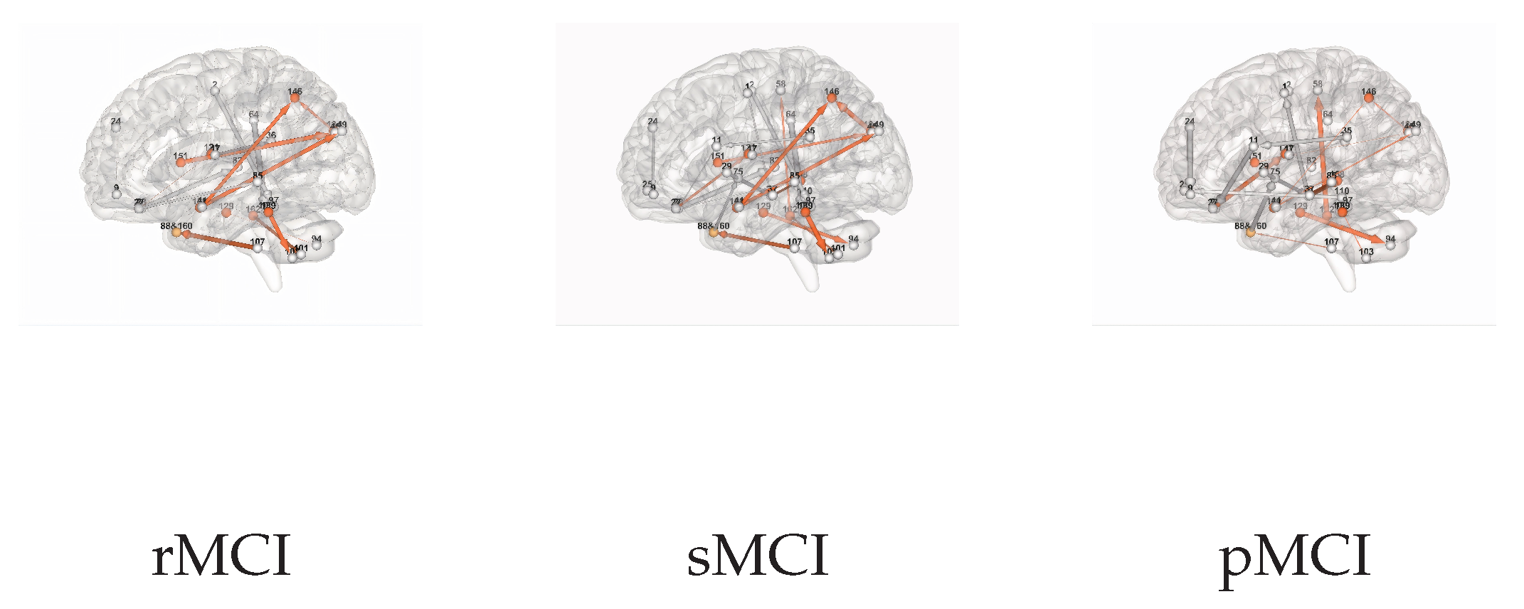 Table 6, our results exceeded those of most of the previous studies, even though these studies utilized data from multiple modalities. This further validates that the effective connectivity based on fMRI can reveal more potent information in the progression of MCI, and it also indicates that there is still much information worth exploring in fMRI data. Meanwhile, it is noteworthy that the classification performance of two adjacent states was lower, namely rMCI vs. sMCI and sMCI vs. pMCI, whereas the accuracy of rMCI vs. pMCI, the two states with larger differences, was higher. This reveals that sMCI, as a stable state in the middle of reversal to normal controls and progress to AD, differed less significantly from the other two states than between sMCI and pMCI in the rs-fMRI brain network. Moreover, when comparing the classification performance in
