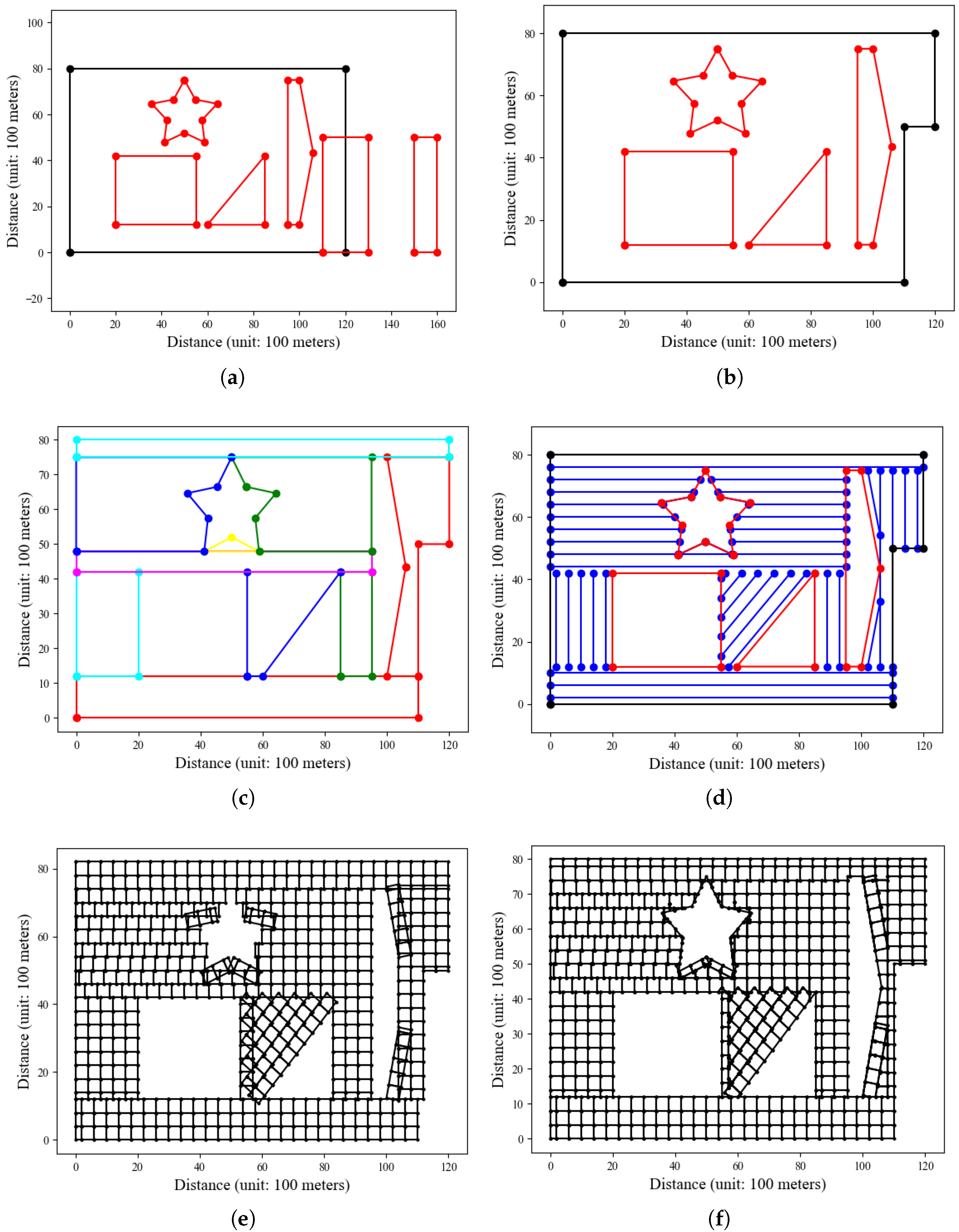 Therefore, the target area segmentation problem can be formally modeled as follows: Given a target area G represented by the polygon P with an outer contour and a set of no-fly zones , where each is a no-fly zone, how can we obtain a set of sub-regions ? Specifically, this set of sub-regions is a partition of the given polygon such that and , and each element is no larger than a square area with side length a.