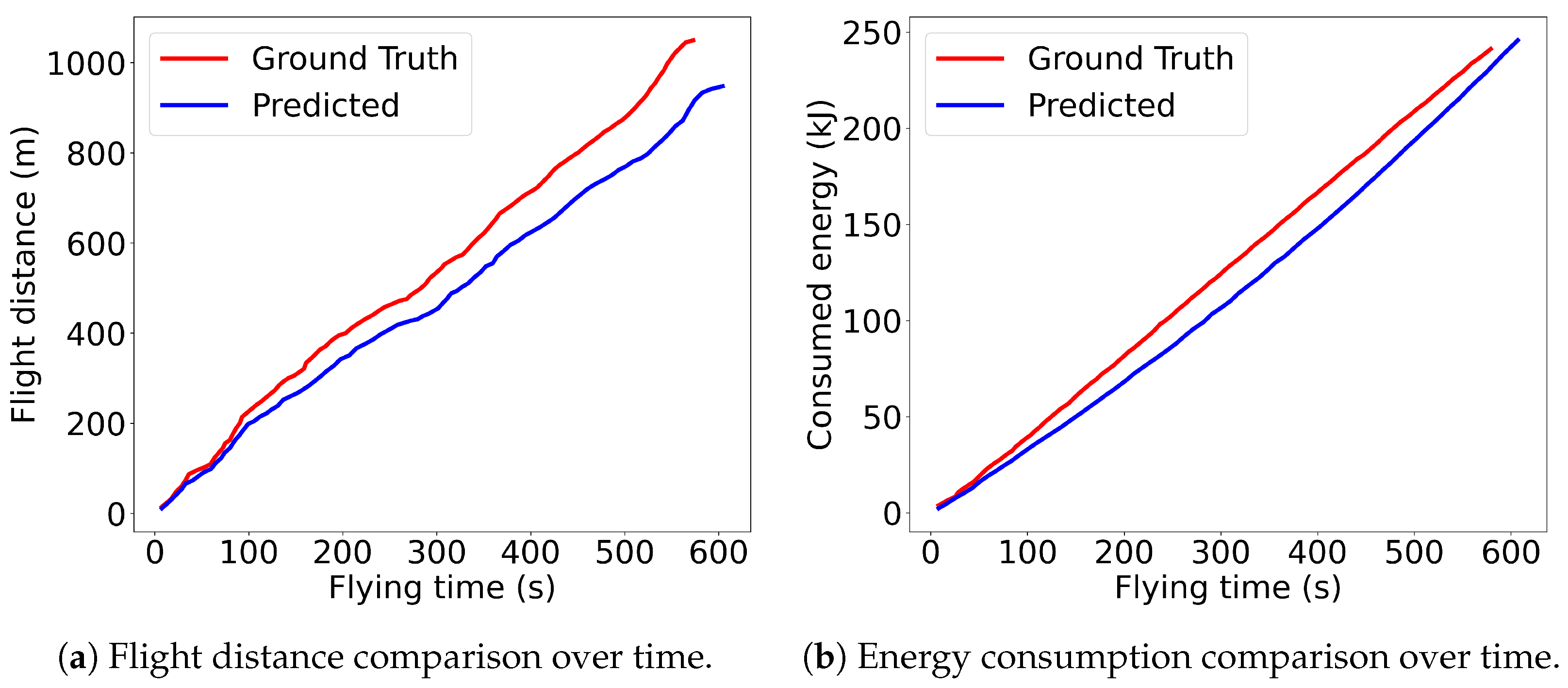 Figure 3, our empirical data revealed a strong linear correlation between the predicted energy consumption from our model and the ground truth data from the UAV’s battery sensor. The close tracking in both flight distance and energy consumption validates our model.