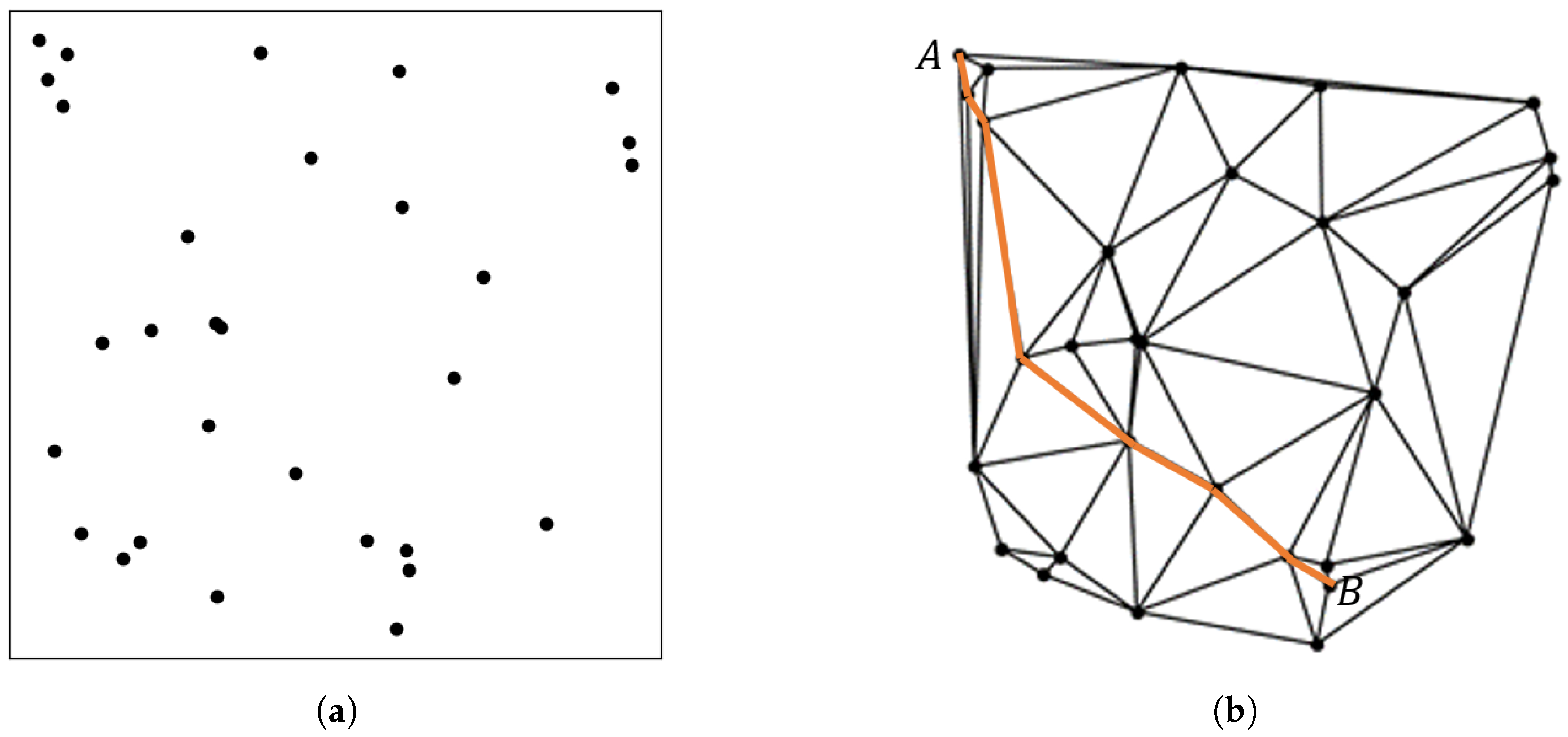 Figure 6). The nodes along these A* paths are added to the point set as auxiliary vertices. A second, final triangulation is then performed on this augmented set of points. This ensures that all connections in the resulting graph are collision-free. The Floyd–Warshall algorithm is then applied to this graph to compute the all-pairs shortest path lengths, yielding a valid cost vector
