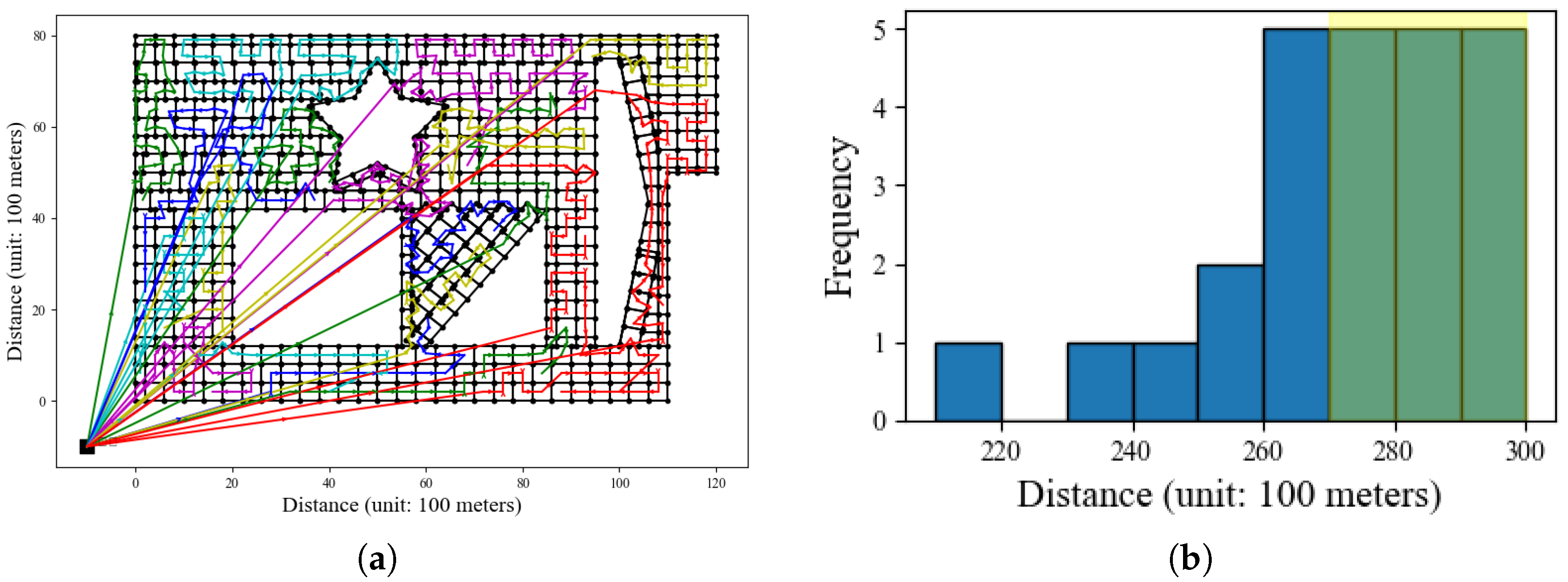 a. We selected a square-based partitioning strategy over alternatives like Voronoi tessellation for two primary reasons. First, it provides a direct and verifiable guarantee that all points within a sub-region are within the UAV’s communication range from a central point, a critical constraint for maintaining stable control. Second, it produces regular units that simplify the subsequent CVRP formulation for inter-mission scheduling. This represents a deliberate trade-off favoring operational robustness and modeling tractability over the potentially more adaptive but complex partitioning offered by other shapes. The study assumes that the UAV’s communication range can fully cover a sub-region with side length