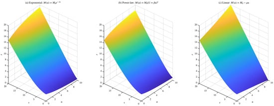 Figure 2 shows for the three mass laws. Each panel depicts a 3D surface with u (horizontal) and v (depth). For any fixed u, r increases with v, since