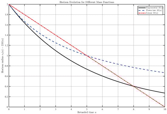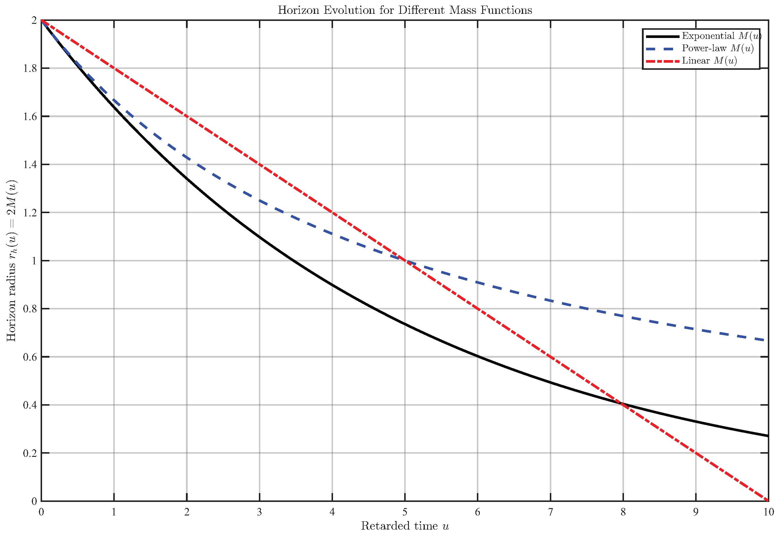 Evolution of the horizon radius for the three mass functions. The retarded time u is on the horizontal axis, and is on the vertical axis. The black solid curve corresponds to the exponential decay ; the blue dashed curve to the power-law decay ; and the red dash-dot line to the linear decay . All models start at , . The exponential and power-law cases approach zero asymptotically as . The linear model’s horizon shrinks at a constant rate, reaching at . This finite time termination of the horizon is unique to the linear model. The more gradual decline of the power-law curve compared with the exponential curve indicates that, at , the power-law horizon is still larger, whereas the exponential horizon has shrunk to ∼0.27. Physically, a slower mass loss leaves a larger anti-trapped region at late times. In contrast, the exponential law’s faster decay produces a smaller horizon at a given time. All curves decrease monotonically, consistent with a continuously evaporating, shrinking white-hole horizon.