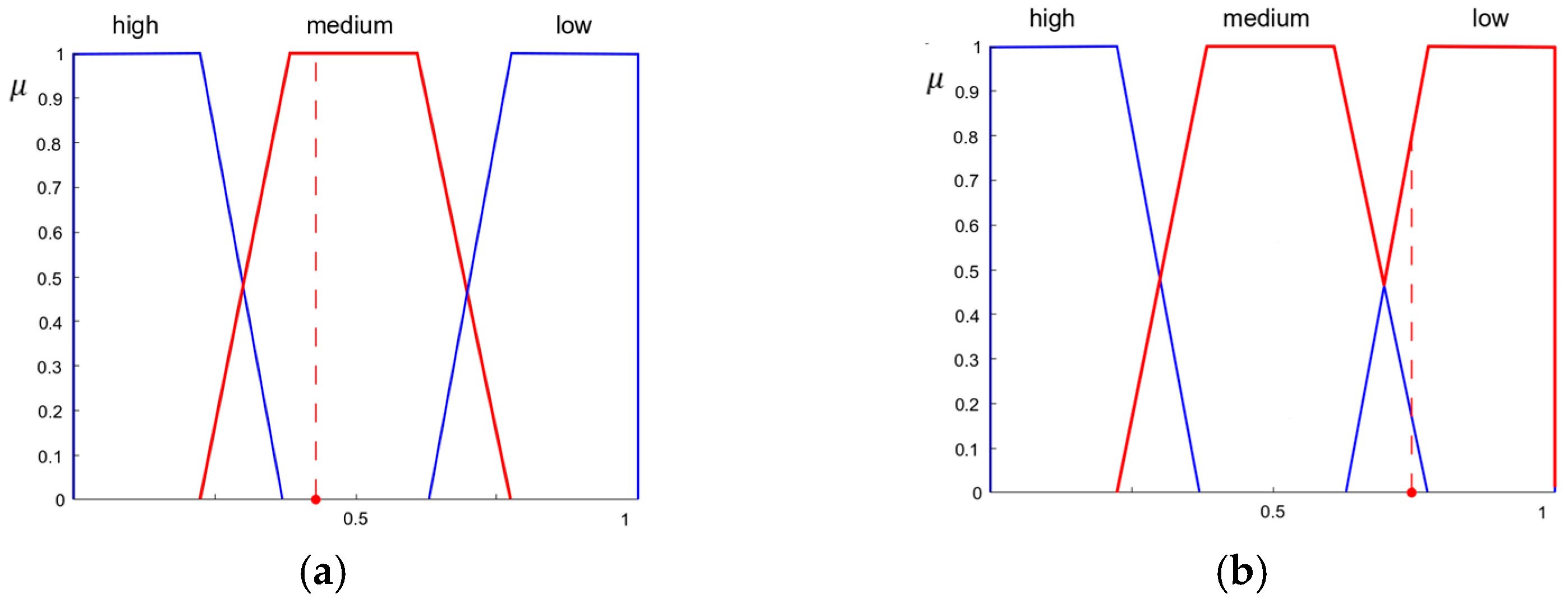 This way, all measured values were fuzzified. The internal vertices, as the roots of subtrees, being responsible for expressing the influencing factors of the root, and there are no predefined values in the literature. Thus, the membership function set of these was defined symmetrically with three or five trapezoidal membership functions based on experts’ advice. There is no argumentation for applying either symmetrical or asymmetrical MFs, and thus, simple symmetrical shapes were selected. After executing the aggregations, the resulting MFs lost their piecewise linear characteristics. These new functions determined the respective reference values by the mean of maxima (MOM) (8) [