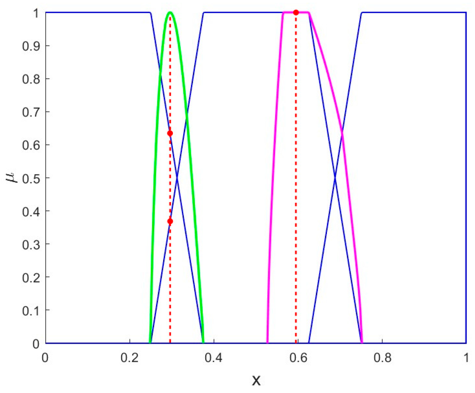 Figure 3, two examples are shown, where the green function’s defuzzified value belongs to the first and second of three categories with different