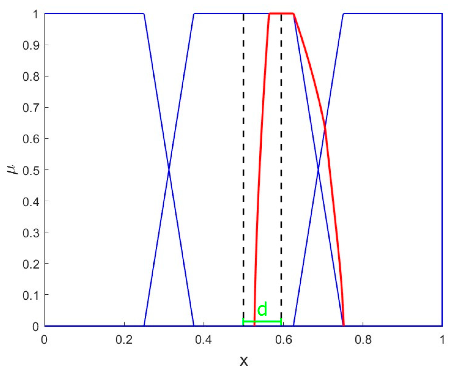 Figure 4. If the crisp value was an element of the MF core interval, the difference was obvious, whereas if it was an element of overlap interval, it was assigned to the MF which had the higher membership value at this point. In the case, when the crisp value was equal to the middle point of overlap interval, where each membership value was 0.5, the distance was measured from the MOM of the lower MF (worse category, to the left of the intersection). But because of the equal division of domain, at the middle point it was not important which adjacent MF provided the reference point. During the optimization, the dataset provided by Dormány [
